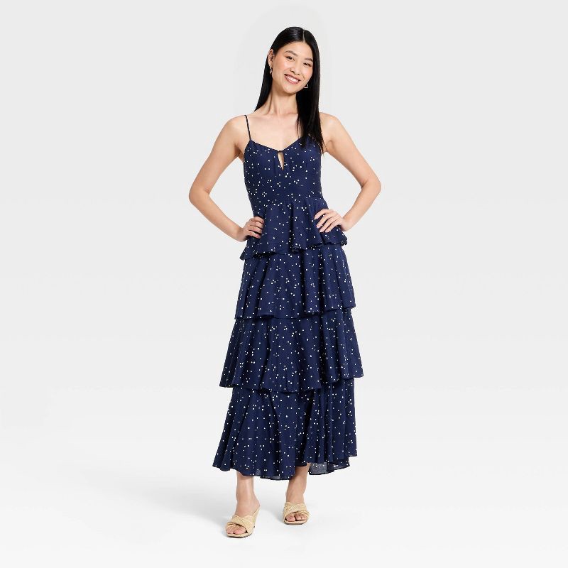 This Tiered Ruffle Maxi Dress from A New Day™ flows and sways with graceful charm. Crafted from lightweight cotton-rayon blend woven fabric, this sleeveless maxi dress is adorned with a white polka-do…
