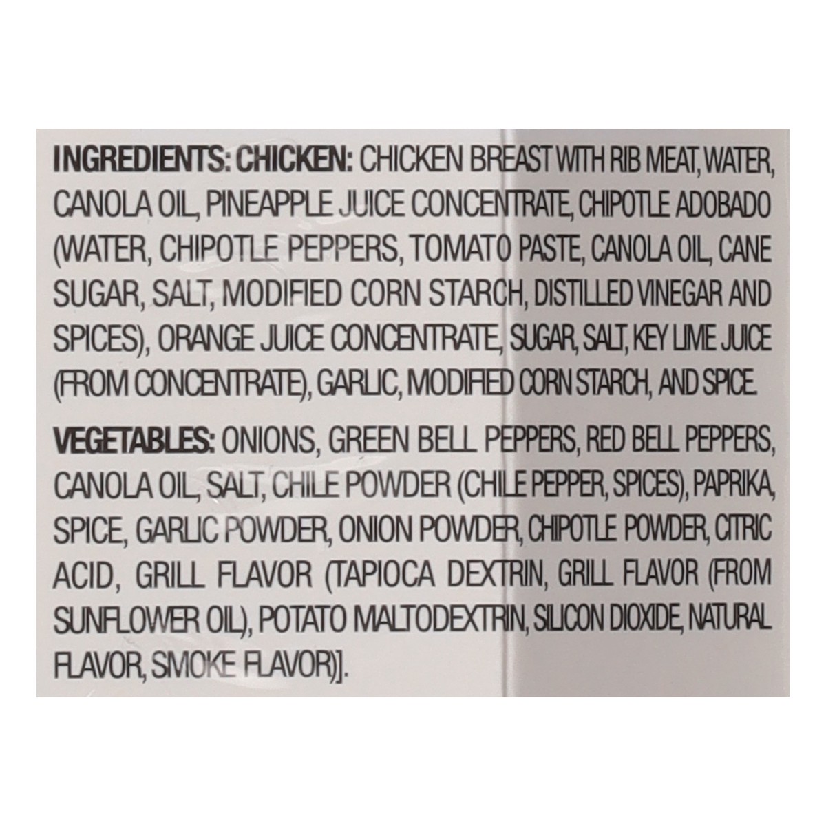 Chicken: Chicken Breast with Rib Meat, Water, Canola Oil, Pineapple Juice Concentrate, Chipotle Adobado (Water, Chipotle Peppers, Tomato Paste, Canola Oil, Cane Sugar, Salt, Modified Corn Starch, Dist…