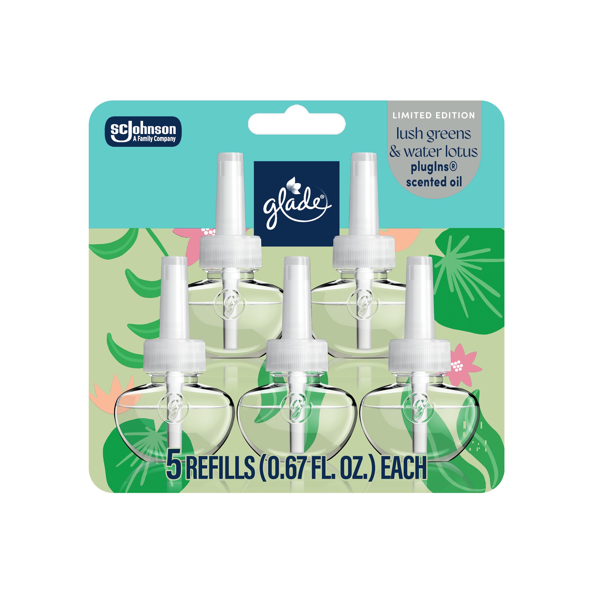 - Includes five Glade Lush Greens & Water Lotus PlugIns scented oil refills infused with earthy, revitalizing springtime scents