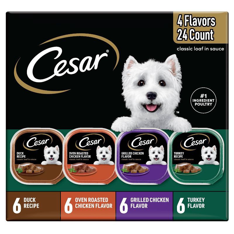 - Variety Pack: Contains twenty-four (24) 3.5 oz. trays of Cesar Classic Loaf in Sauce Wet Dog Food Variety Pack: (6) Duck Recipe, (6) Oven Roasted Chicken Flavor, (6) Grilled Chicken Flavor, and (6) Turkey Recipe.