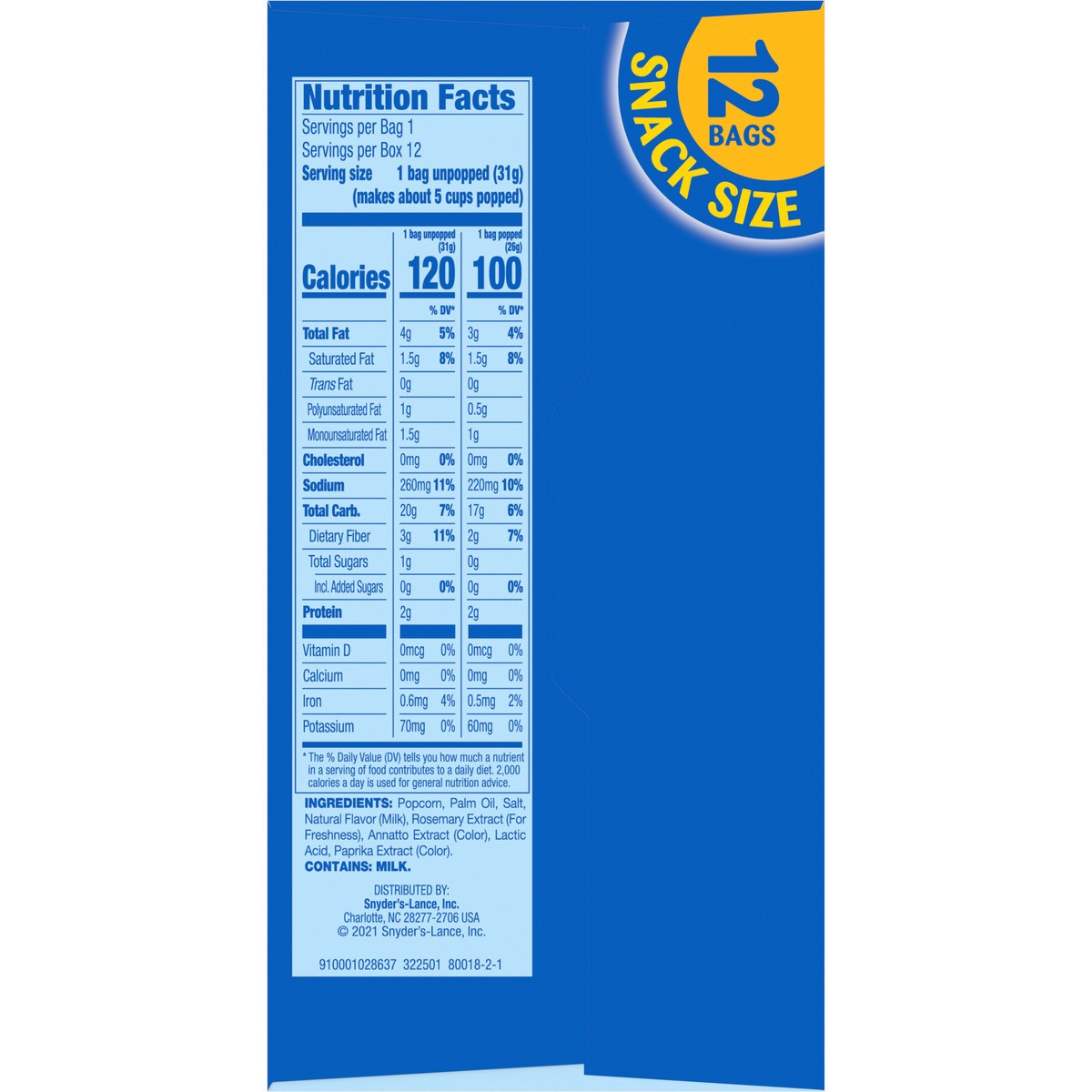 INGREDIENTS: POPCORN, PALM OIL, SALT, NATURAL FLAVOR (MILK), ROSEMARY EXTRACT (FOR FRESHNESS), ANNATTO EXTRACT (COLOR), LACTIC ACID, PAPRIKA EXTRACT (COLOR). CONTAINS: MILK