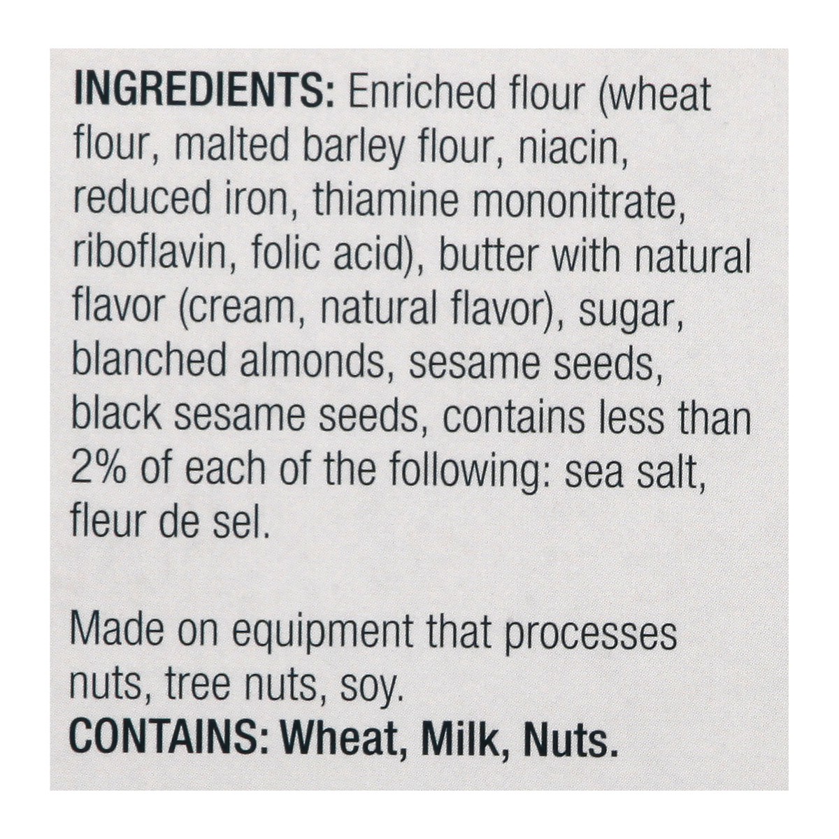 Enriched Flour (Wheat Flour, Malted Barley Flour, Niacin, Reduced Iron, Thiamine Mononitrate, Riboflavin, Folic Acid), Butter with Natural Flavor (Cream, Natural Flavor), Sugar, Blanched Almonds, Sesa…