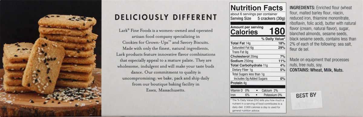 Sweet & savory biscuit with toasted sesame seeds. Deliciously Different: Lark Fine Foods is a women-owned and operated artisan food company specializing in Cookies for Grown-Ups. Lark cookies are made…