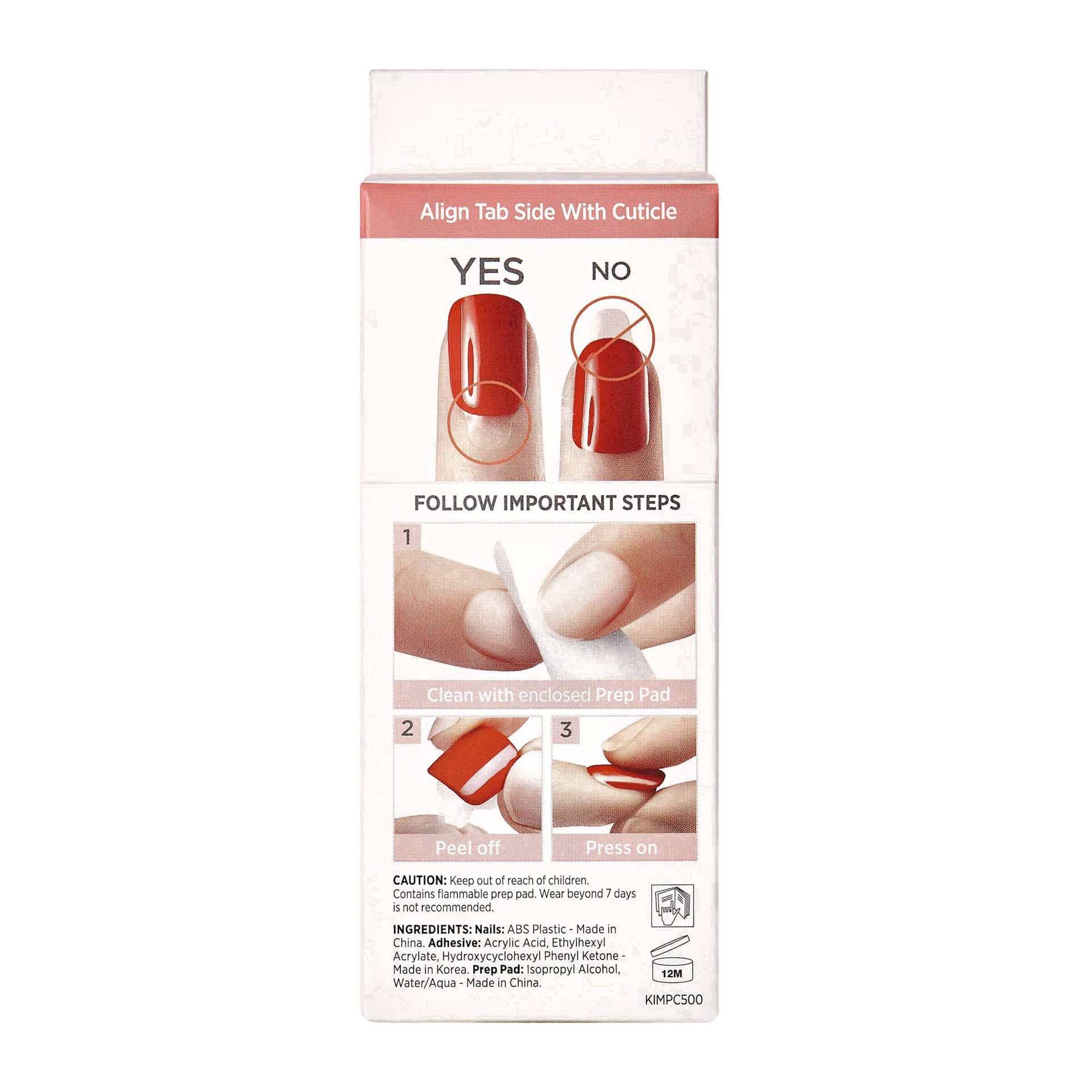 Nails: ABS Plastic. Adhesive: Acrylates Copolymer. Prep Pad: Isopropyl Alcohol, Water/Aqua.