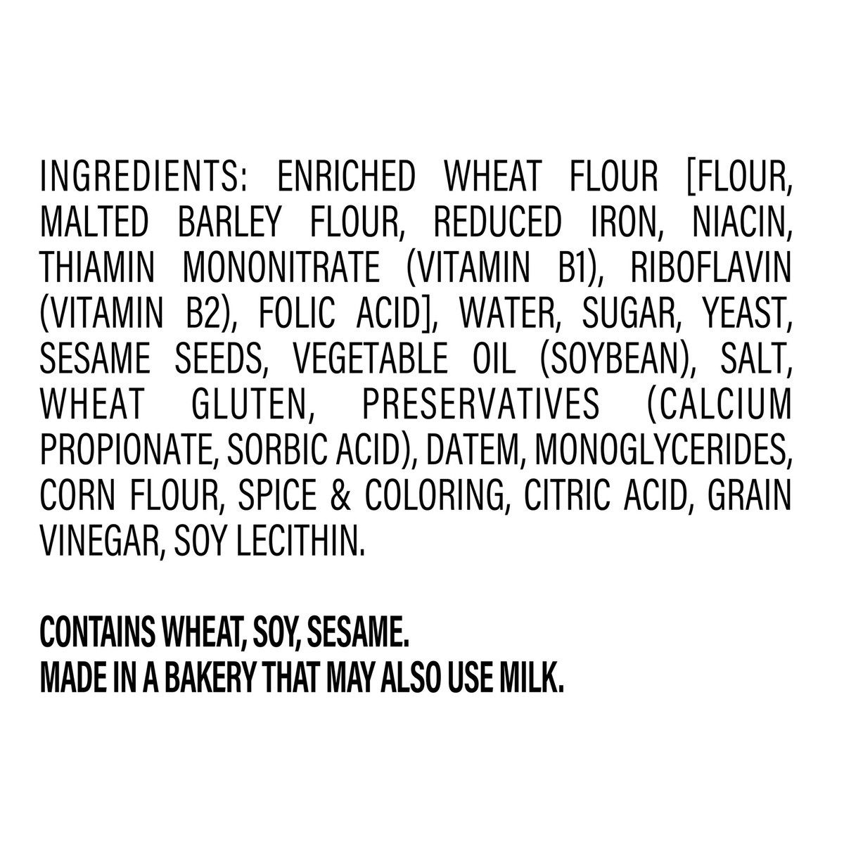 Enriched Wheat Flour [Flour, Malted Barley Flour, Reduced Iron, Niacin, Thiamin Mononitrate (Vitamin B1), Riboflavin (Vitamin B2), Folic Acid], Water, Sugar, Yeast, Sesame Seeds, Vegetable Oil (Soybea…