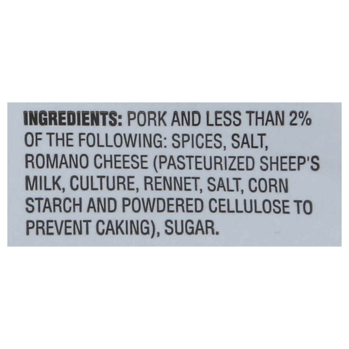 Pork and Less than 2% of the Following: Spices, Salt, Romano Cheese (Pasteurized Sheep''s Milk, Culture, Rennet, Salt, Corn Starch and Powdered Cellulose to Prevent Caking), Sugar.