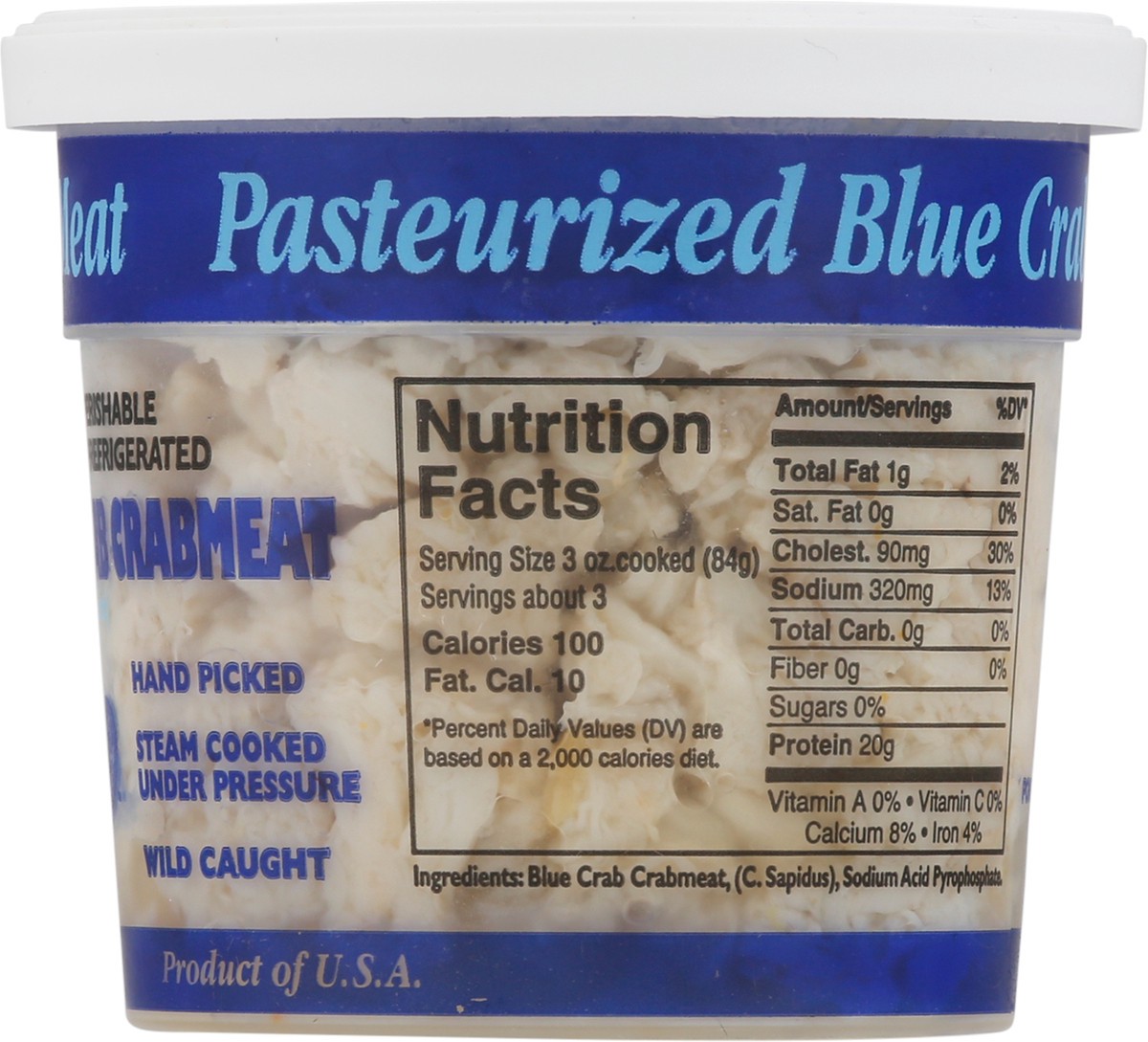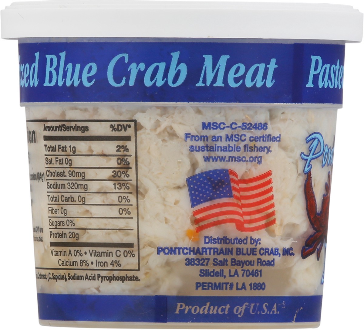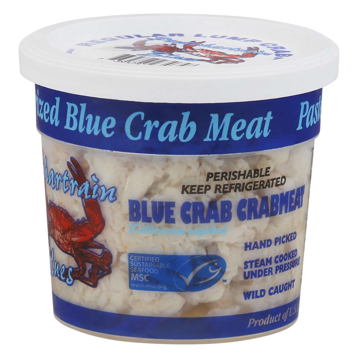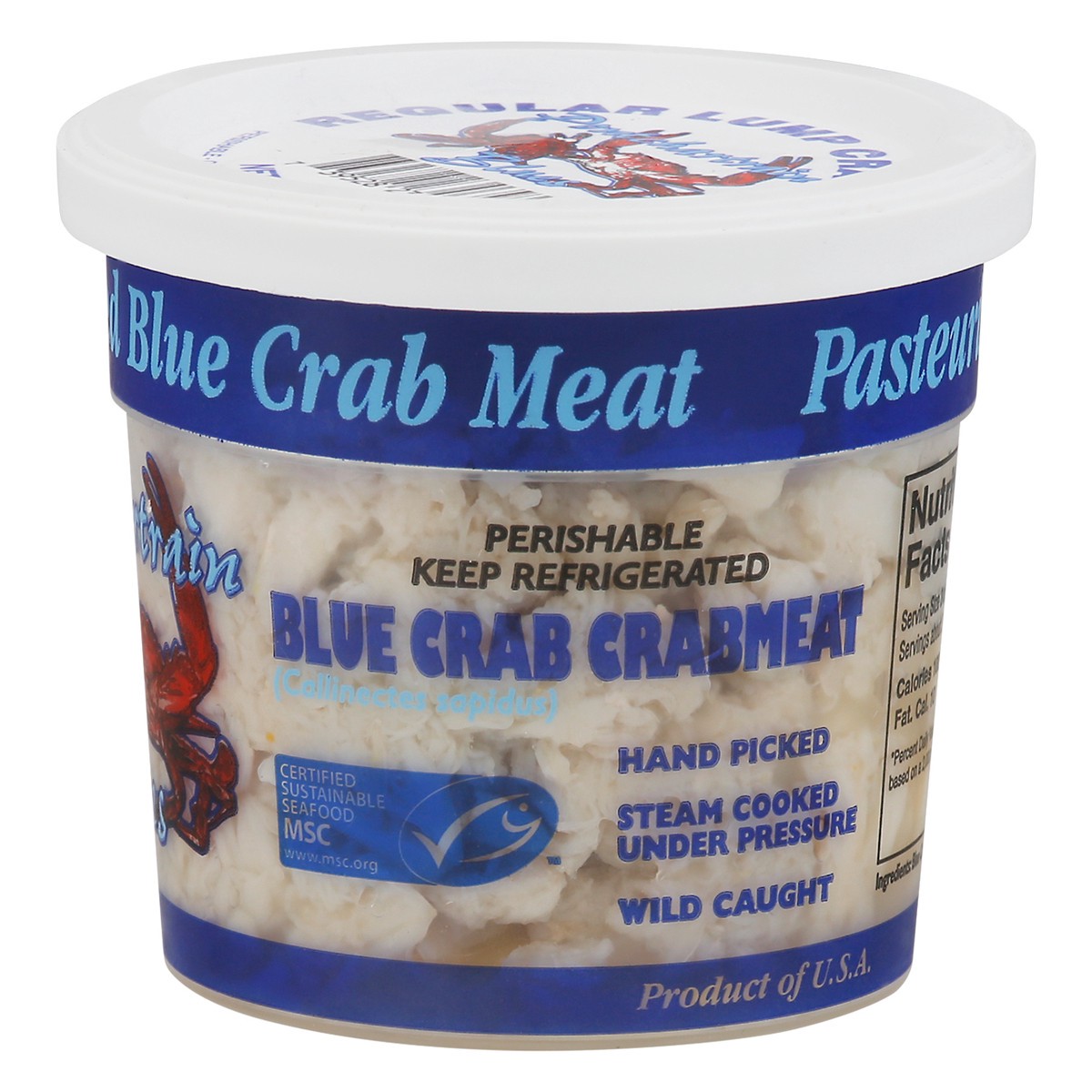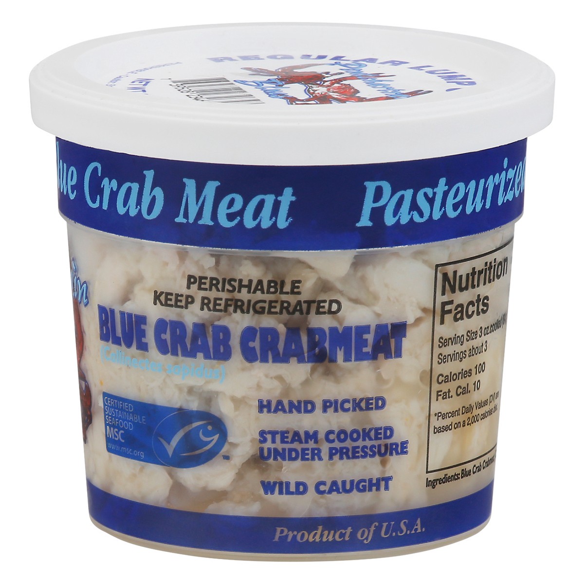 Blue Crab Meat (Callinectes sapidus). Hand picked. Steam cooked under pressure. Wild caught. Pasteurized blue crab. Certified Sustainable Seafood MSC www.msc.org. From an MSC certified sustainable fis…