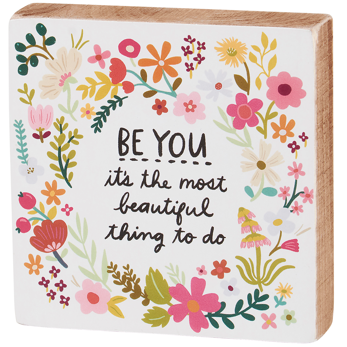 A colorful wooden block sign displaying hand illustrated abstract florals surrounding an inspirational sentiment that reads "Be You - It's The Most Beautiful Thing To Do." Inspirational block sign fea…