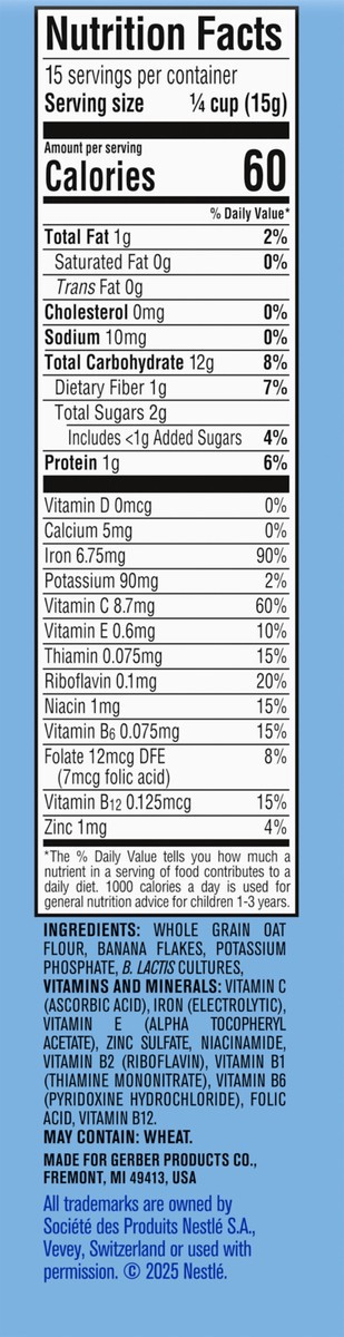 Whole Grain Oat Flour, Banana Flakes, Potassium Phosphate, B, Lactis Cultures, Vitamins and Minerals: Vitamin C (Ascorbic Acid), Iron (Electrolytic), Vitamin E (Alpha Tocopheryl Acetate), Zinc Sulfateā¦