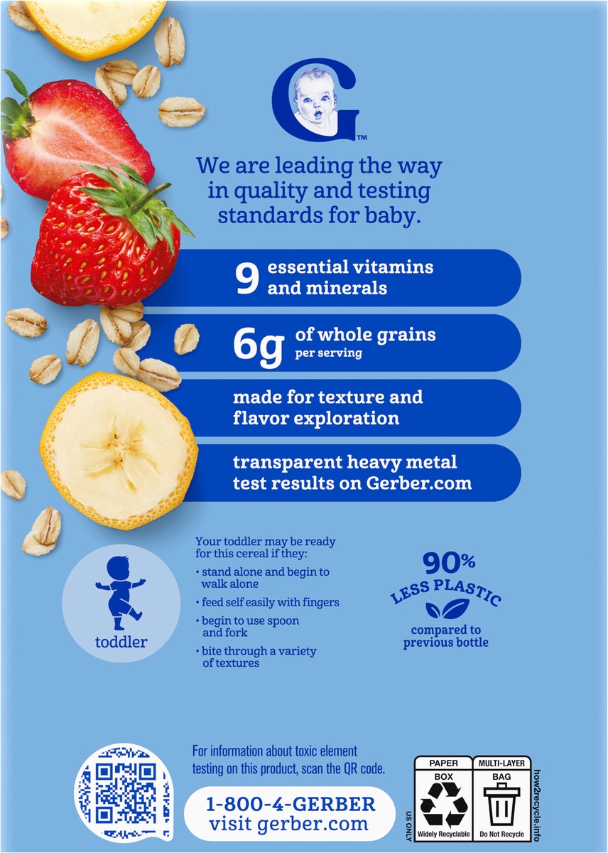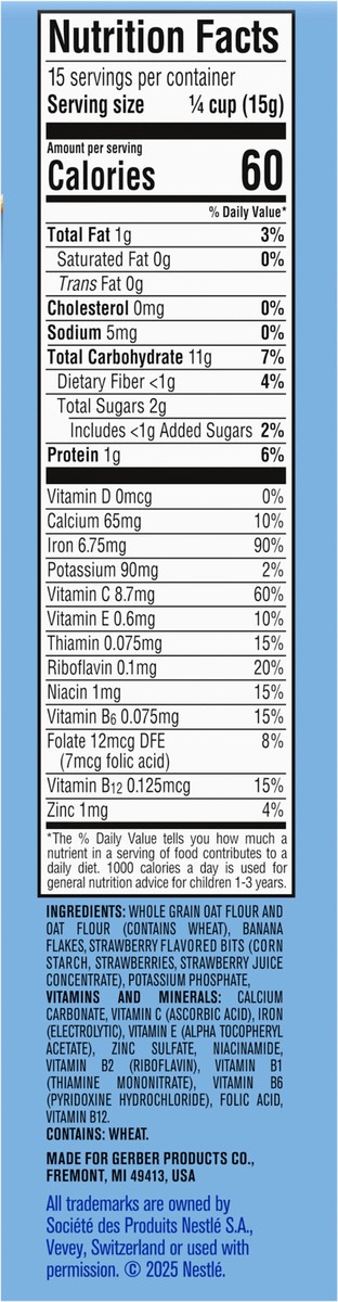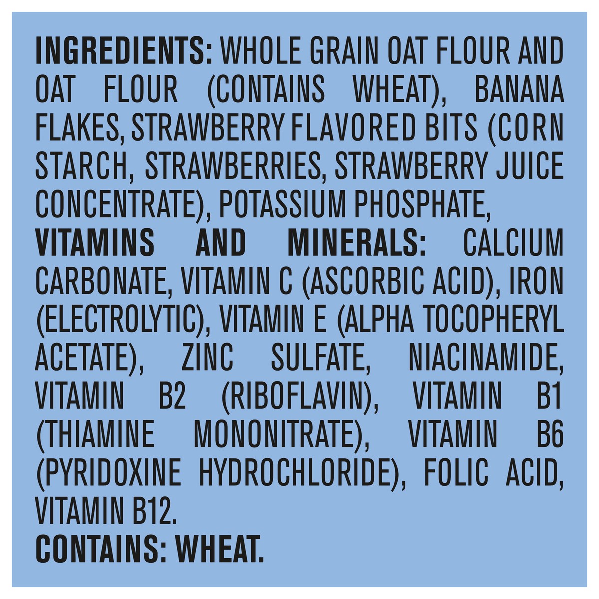 Whole Grain Oat Flour and Oat Flour, Banana Flakes, Strawberry Flavored Bits (Corn Starch, Strawberries, Strawberry Juice Concentrate), Potassium Phosphate, Vitamins and Minerals: Calcium Carbonate, V…