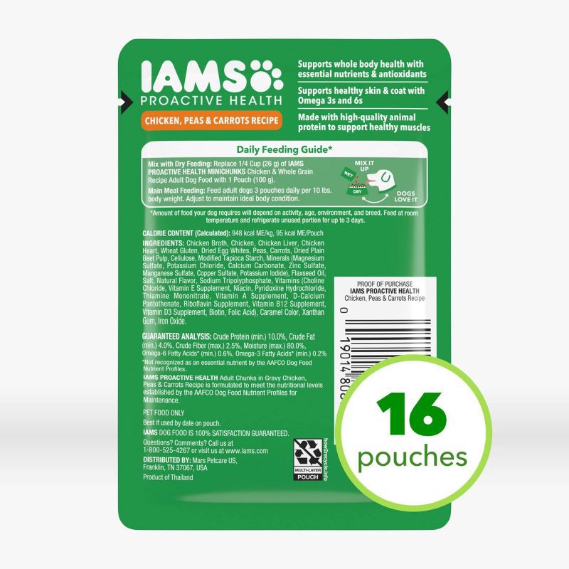 - Contains: Contains one (1) 3.5 oz. pouch of IAMS Proactive Health Adult Wet Dog Food Chicken, Peas and Carrots Recipe.