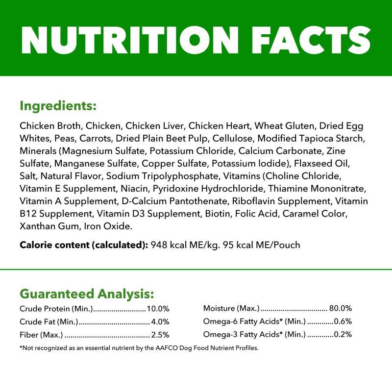 Chicken Broth, Chicken, Chicken Liver, Chicken Heart, Wheat Gluten, Dried Egg Whites, Peas, Carrots, Dried Plain Beet Pulp, Cellulose, Modified Tapioca Starch, Minerals (Magnesium Sulfate, Potassium C…