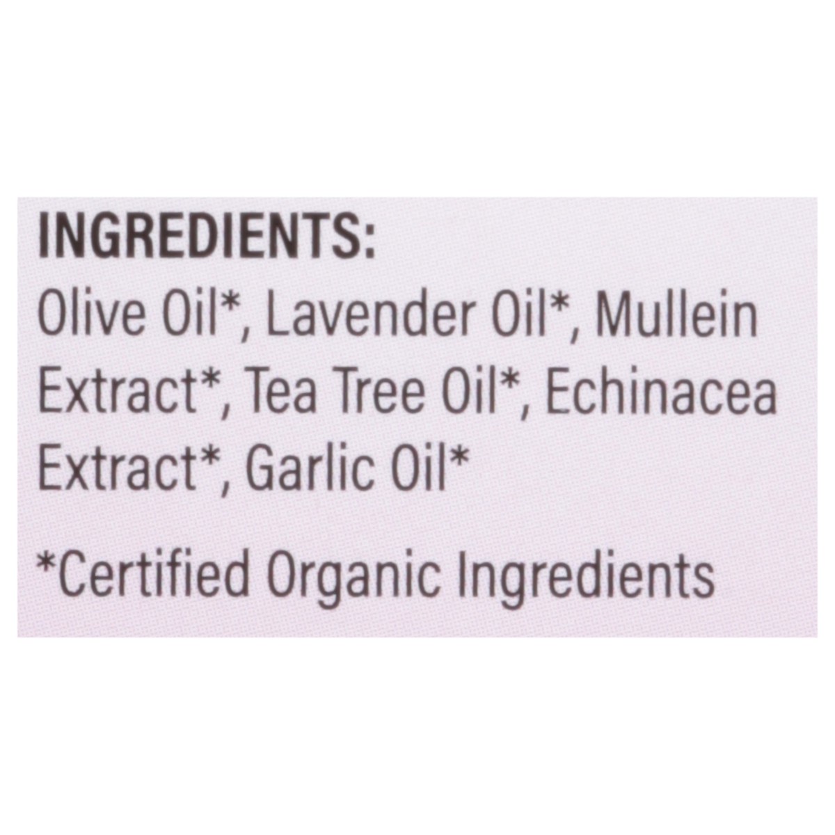Olive Oil*, Lavender Oil*, Mullein Extract*, Tea Tree Oil*, Echinacea Extract*, Garlic Oil*. * Certified Organic Ingredients.