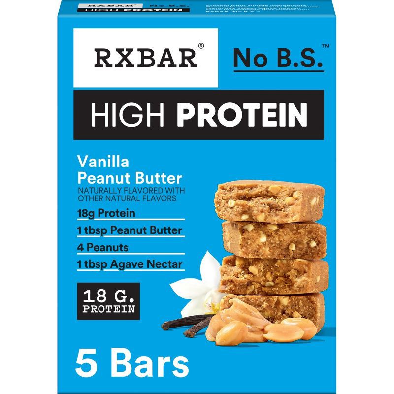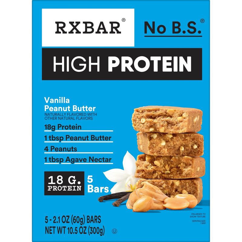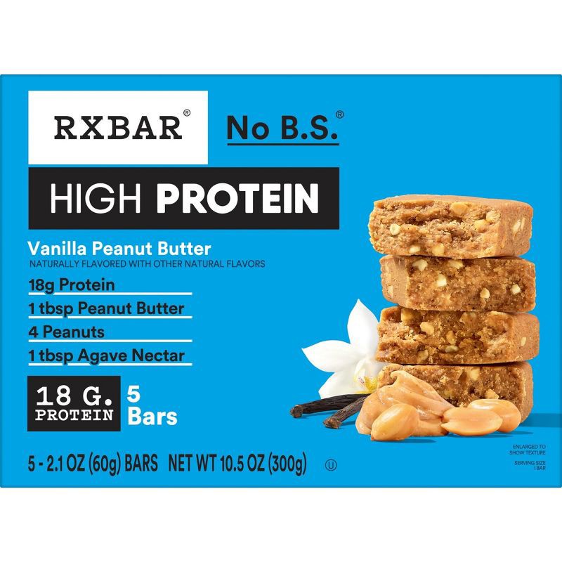 - Includes 1, 10.5oz box containing 5 RXBAR High Protein Vanilla Peanut Butter bars
