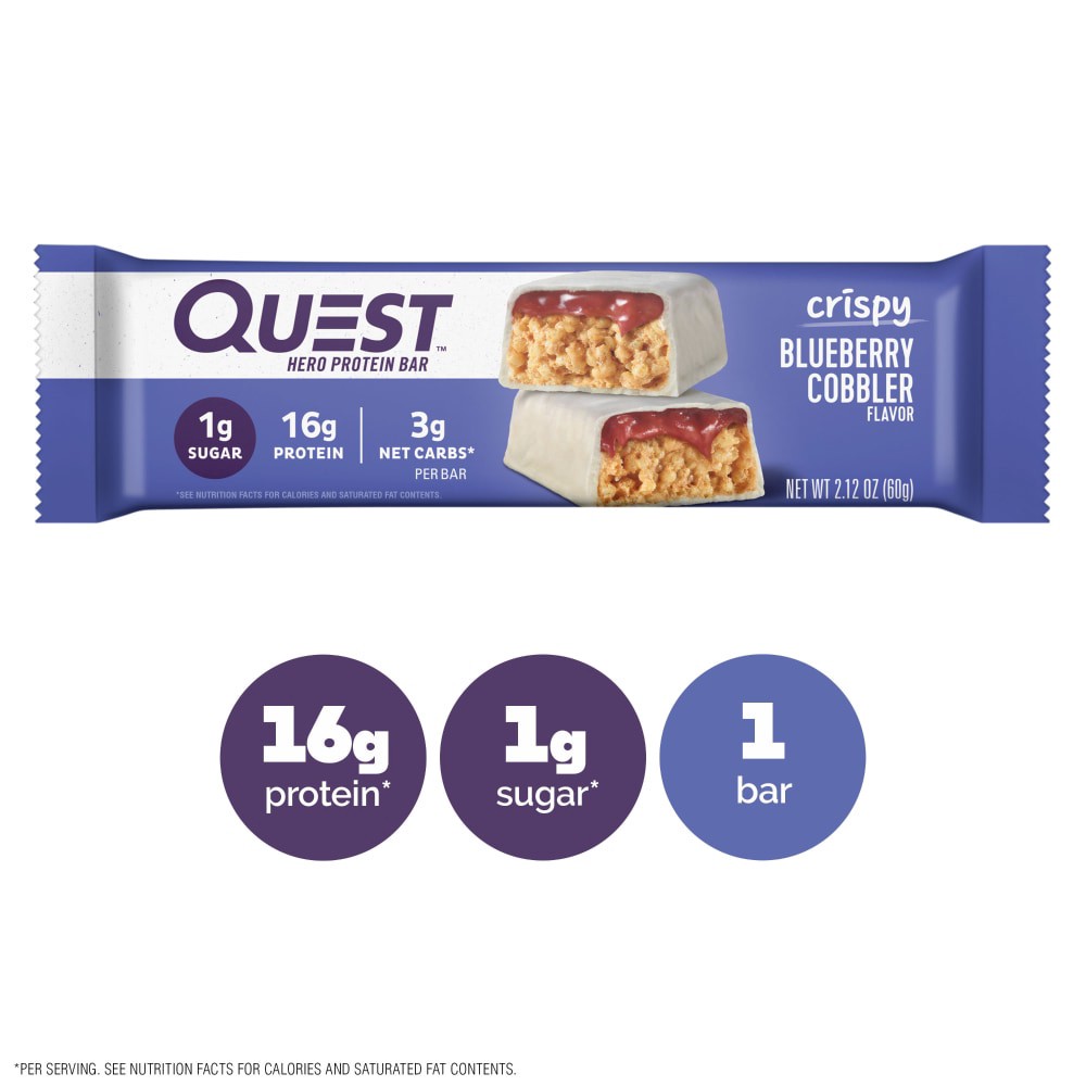 - YOU DESERVE A SWEET TREAT: The Quest Crispy Blueberry Cobbler Hero Protein Bar tastes like an oven-baked cobbler. Only our version has 17g protein, 3g net carbs and 1g of sugar.