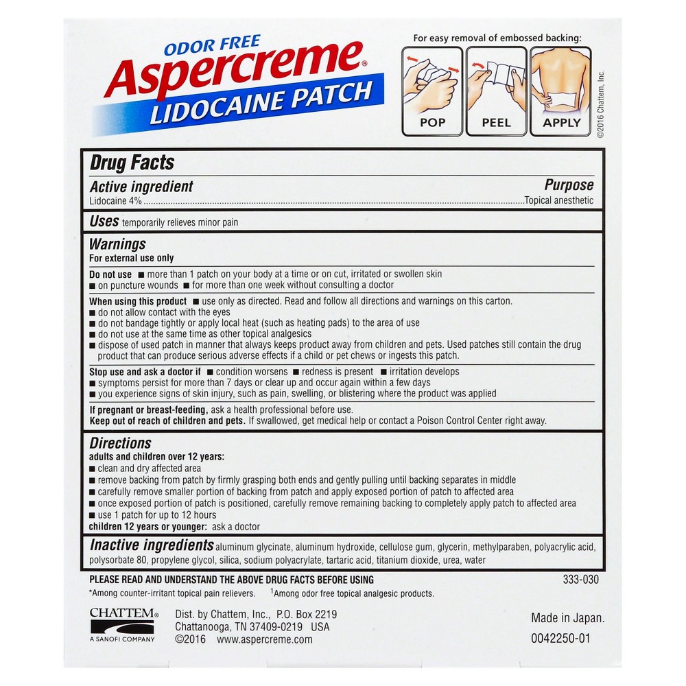 3-15/16 inch x 5-1/2 inch (10 cm x 14 cm) each. Pain relieving ointment on a breathable adhesive pad. With 4% lidocaine. Pain relief patch. No. 1 lidocaine brand (Among OTC topical analgesics). Fast a…