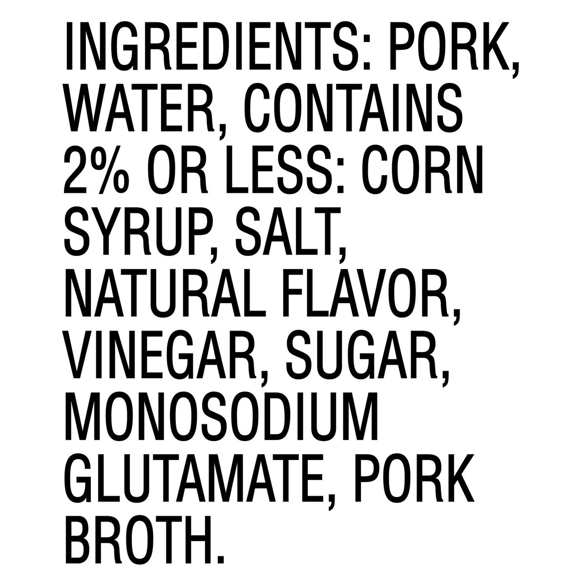 Pork, Water, Contains 2% or Less: Corn Syrup, Salt, Natural Flavor, Vinegar, Sugar, Monosodium Glutamate, Pork Broth.