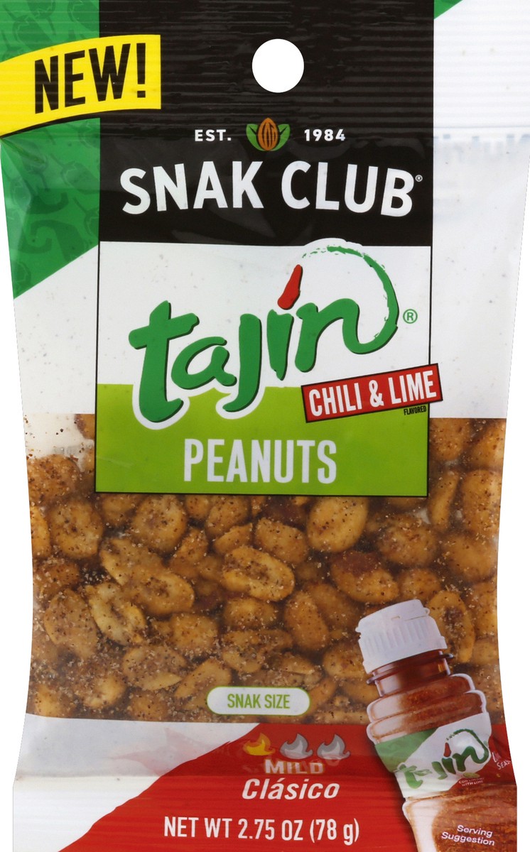 New! Est. 1984. Roasted peanuts seasoned with Tajin Clasico Chili Lime Seasoning. Per Serving: 7 g protein; 2 g fiber. No artificial flavors. Enjoy our Snak Club Tajin-seasoned snacks, made exclusivel…