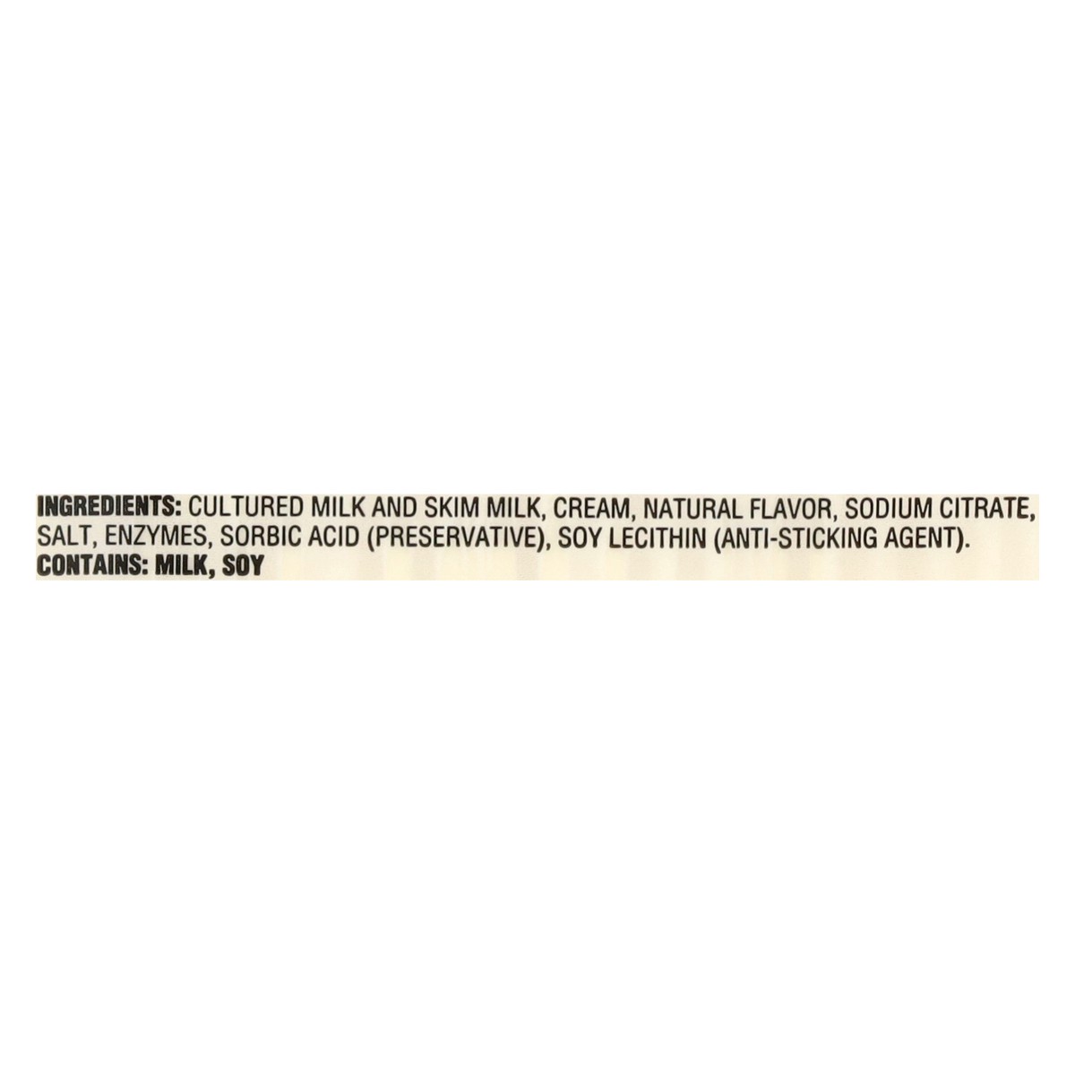 Cultured Milk and Skim Milk, Cream, Natural Flavor, Sodium Citrate, Salt, Enzymes, Sorbic Acid (Preservative), Soy Lecithin (Anti-Sticking Agent).