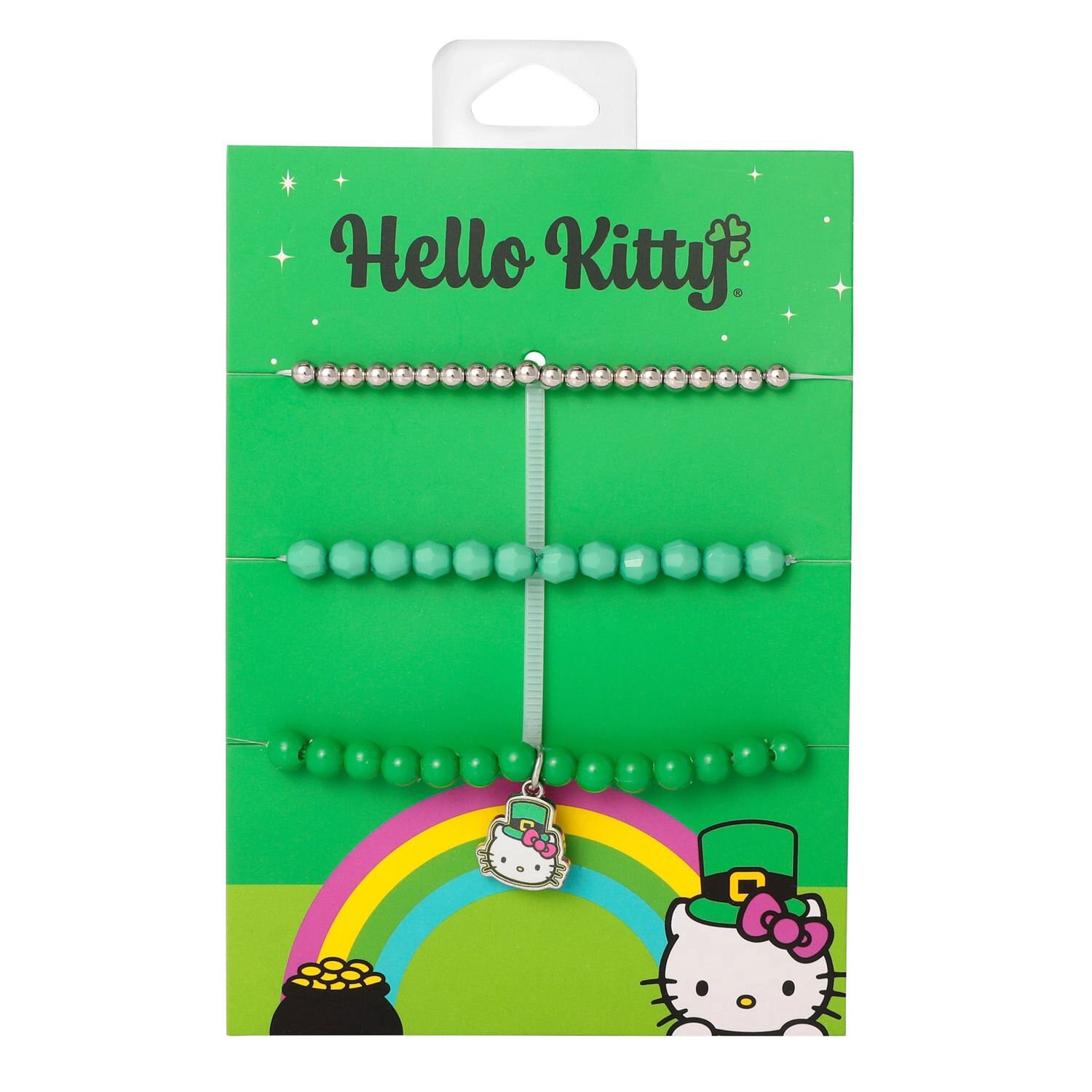 The set includes 3 stretch beaded bracelets in shades of green. One with a Hello Kitty charm. The other bracelets are plain beads. Adorable Hello Kitty St. Patrick's Day Bracelet Set Charm with a St. …
