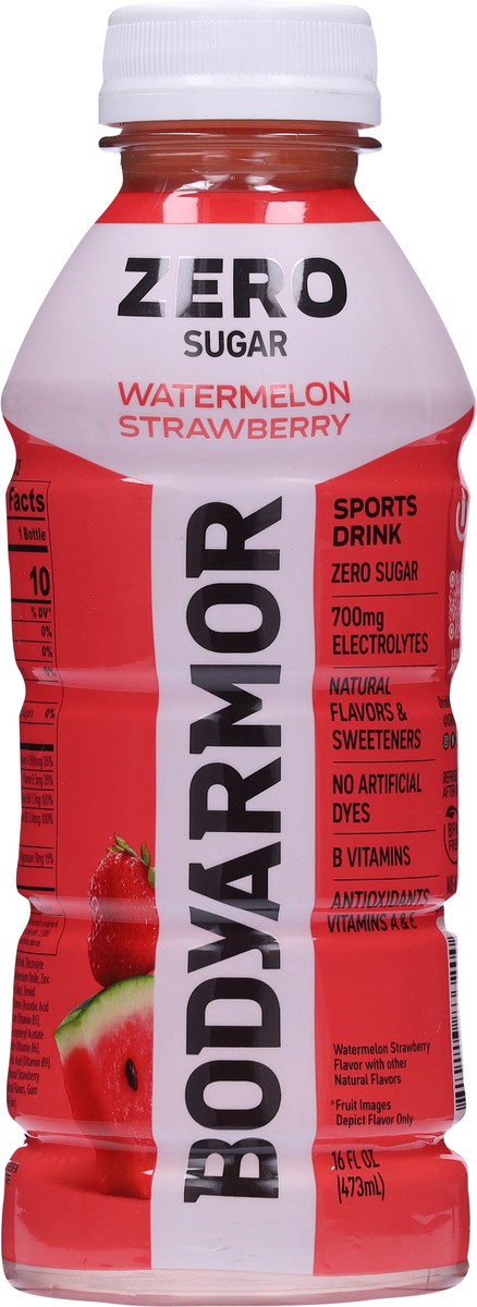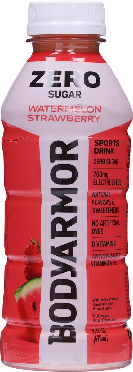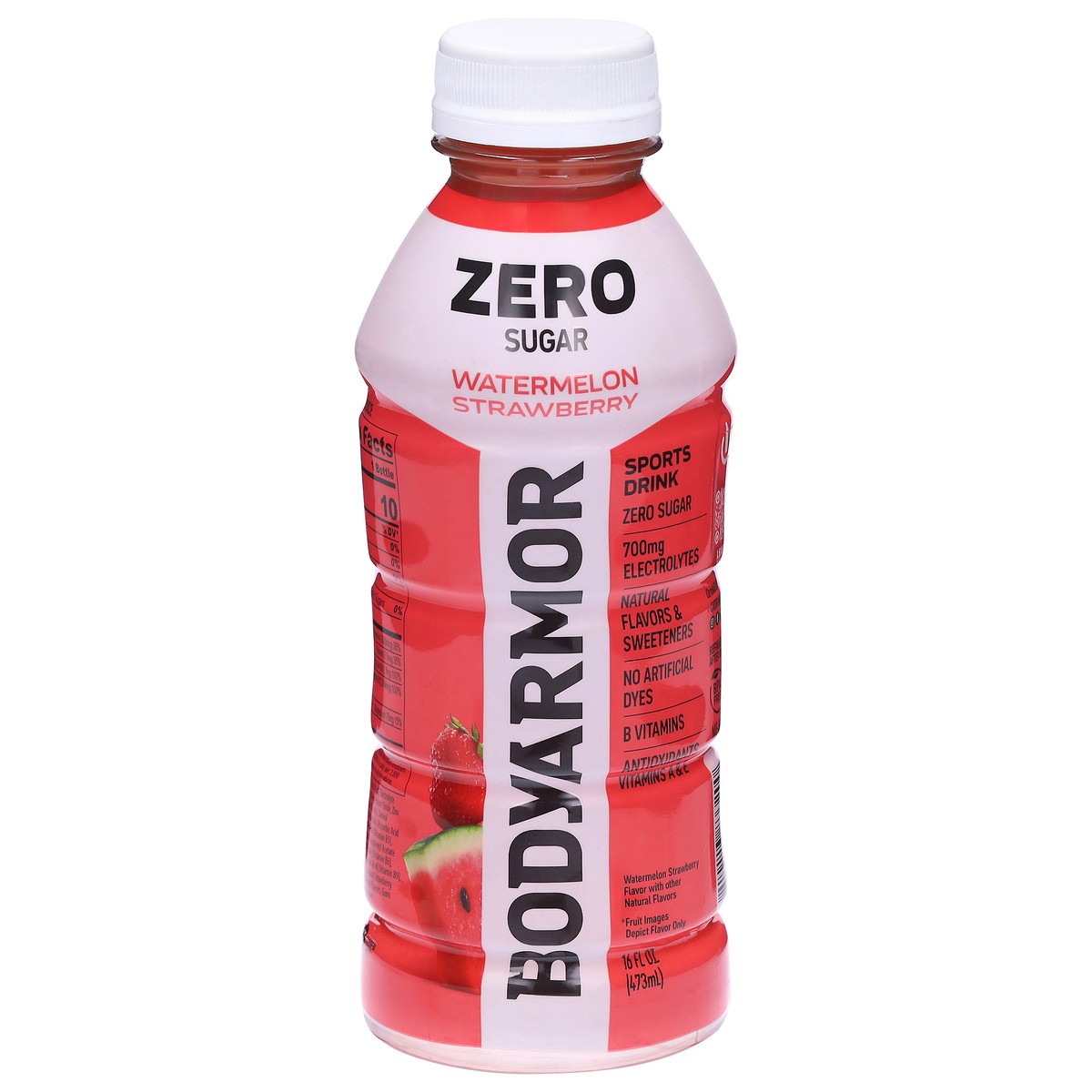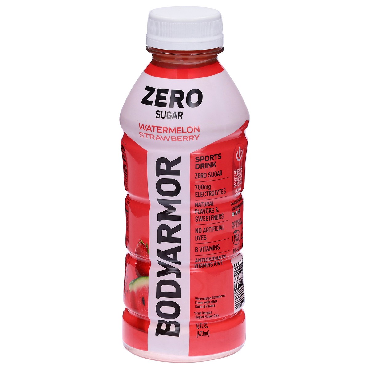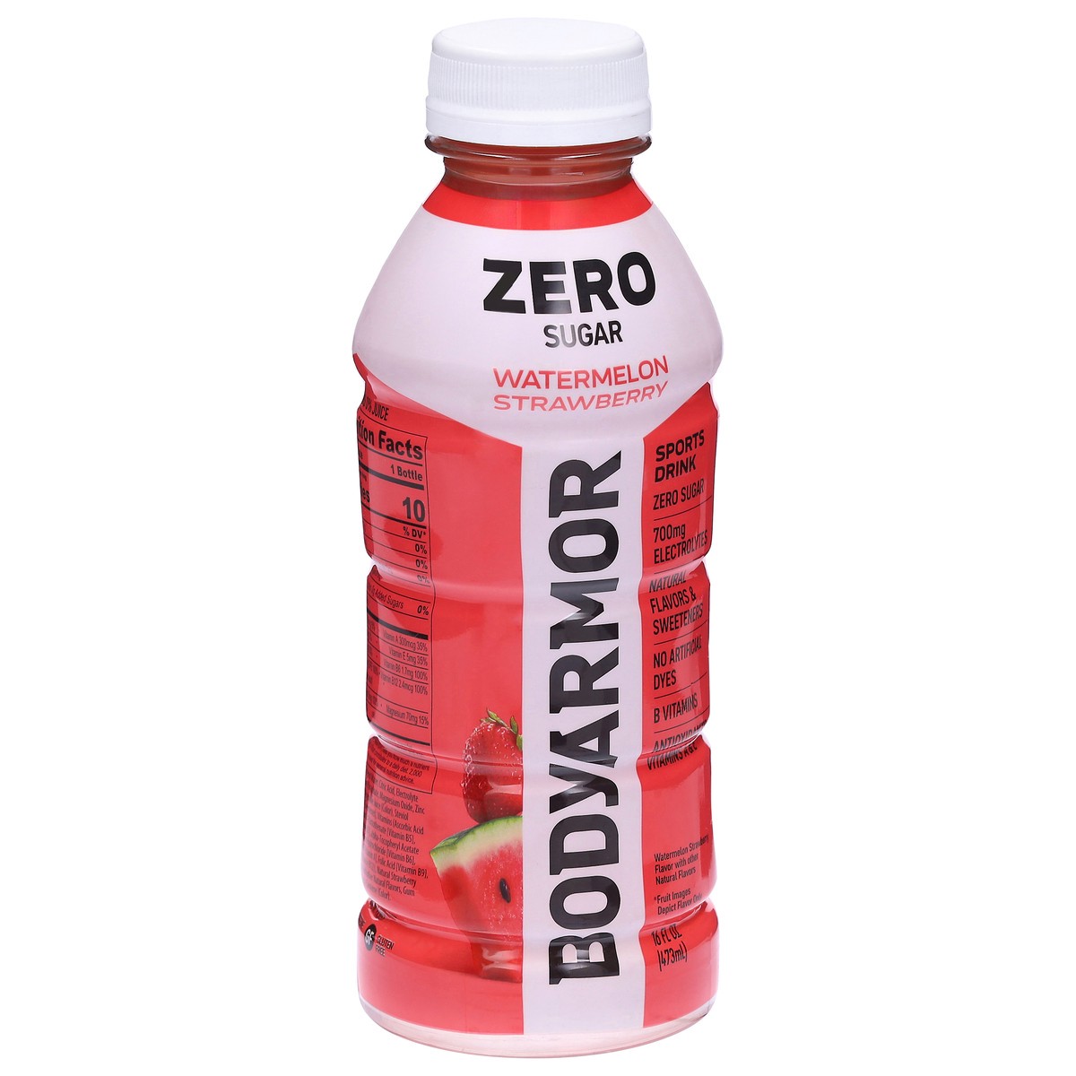 - Or dyesNaturally flavored watermelon strawberry for a delicious surge of hydration16 fl oz bottle of BODYARMOR Zero Sugar Watermelon Strawberry electrolyte drink to refresh your relentless drive all day