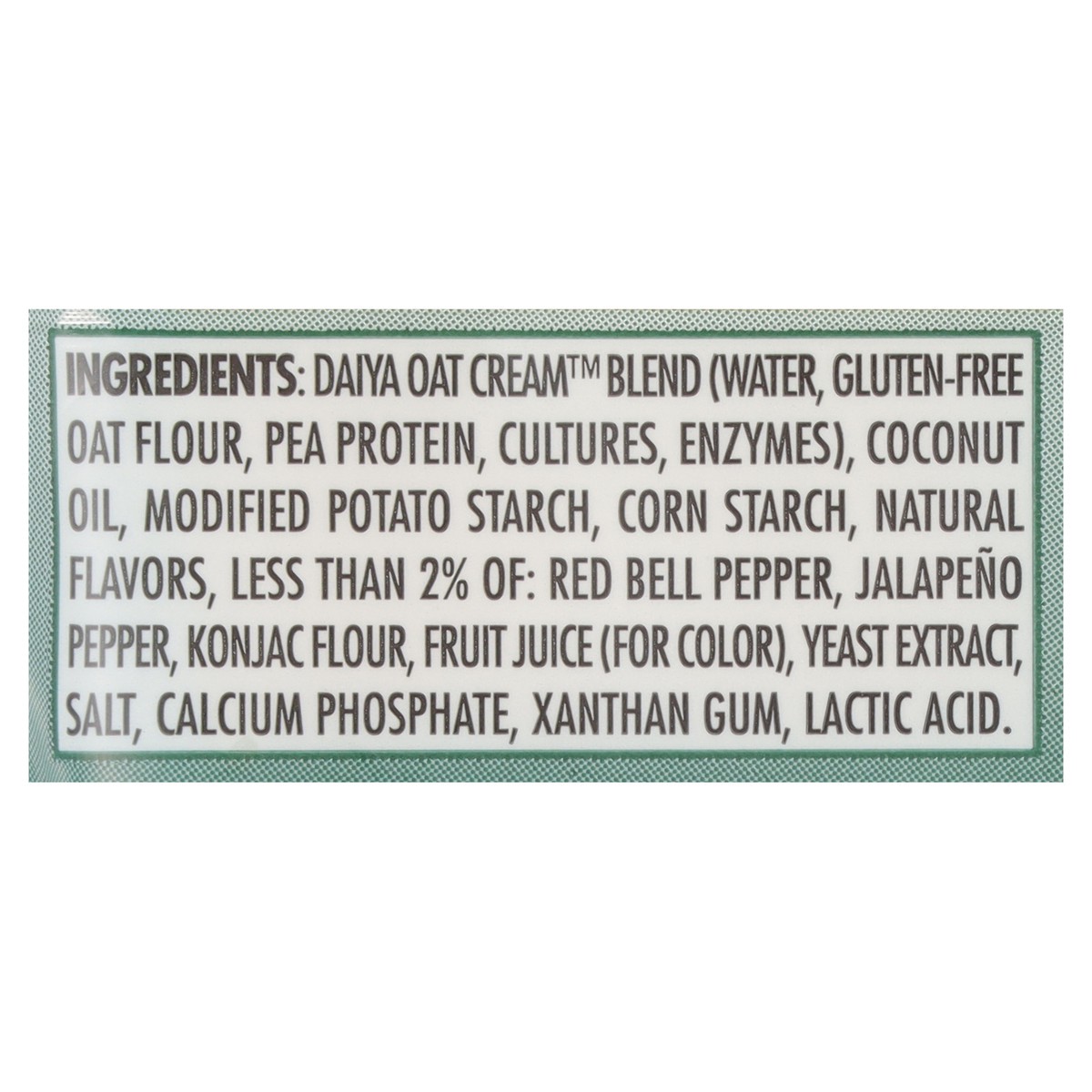 Daiya Oat Cream Blend (Water, Gluten-Free Oat Flour, Pea Protein, Cultures, Enzymes), Coconut Oil, Modified Potato Starch, Corn Starch, Natural Flavors, Less than 2% of: Red Bell Pepper, Jalapeno Pepp…