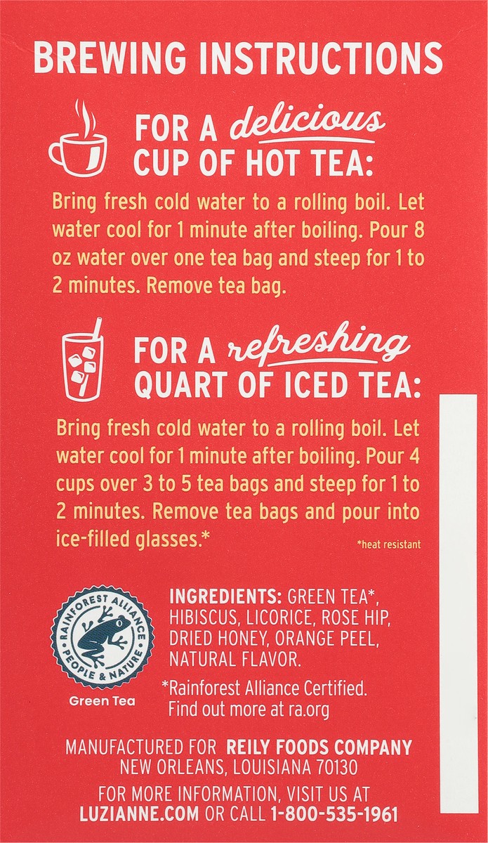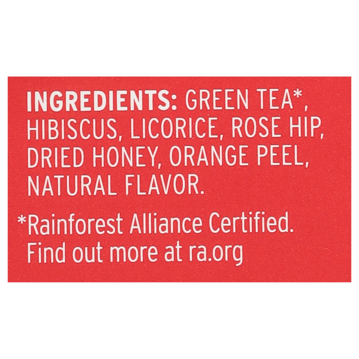 Green Tea (Rainforest Alliance Certified, Find Out More at ra.org), Hibiscus, Licorice, Rose Hip, Dried Honey, Orange Peel, Natural Flavor.