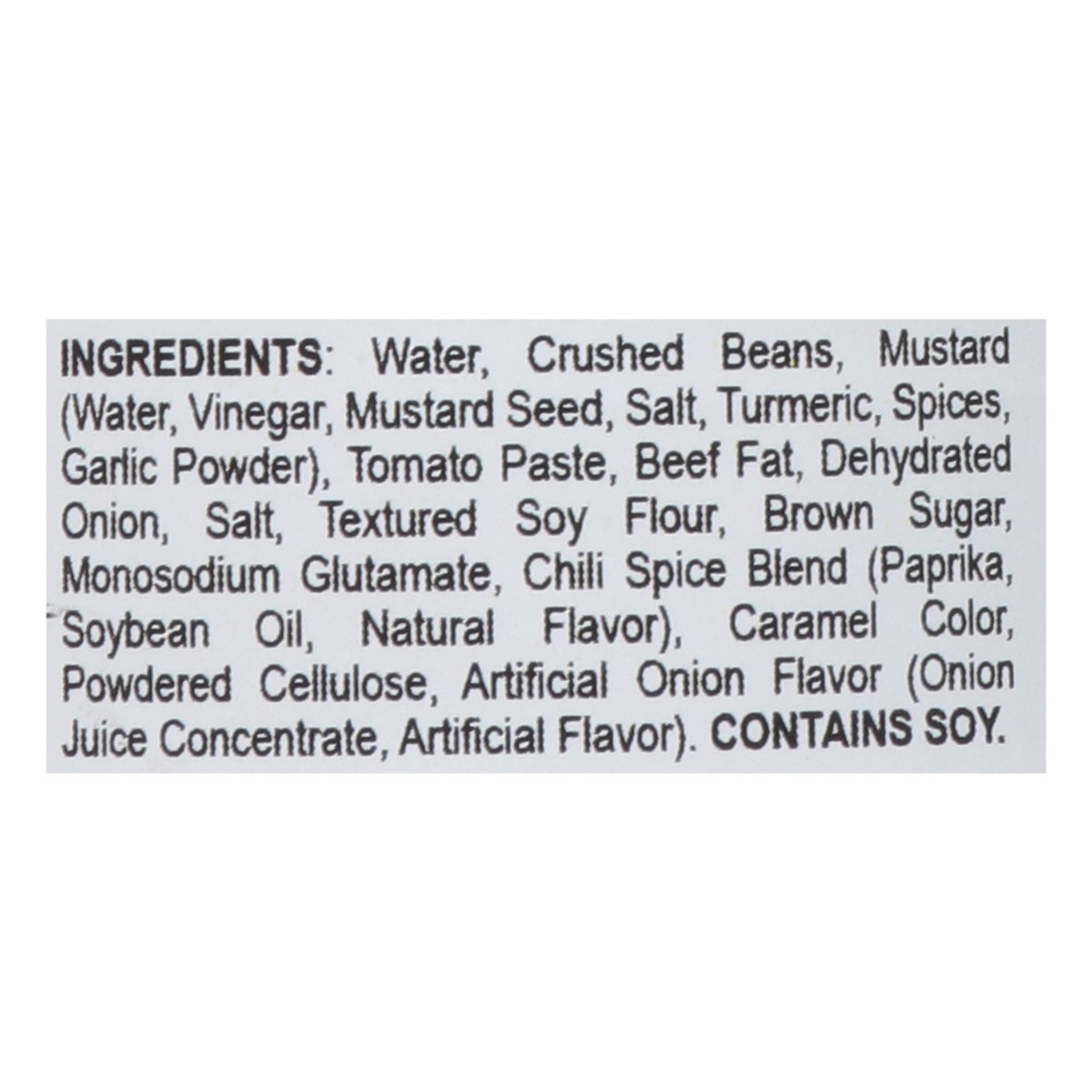 Water, Crushed Beans, Mustard (Water, Vinegar, Mustard Seed, Salt, Turmeric, Spices, Garlic Powder), Tomato Paste, Beef Fat, Dehydrated Onion, Salt, Textured Soy Flour, Brown Sugar, Monosodium Glutama…