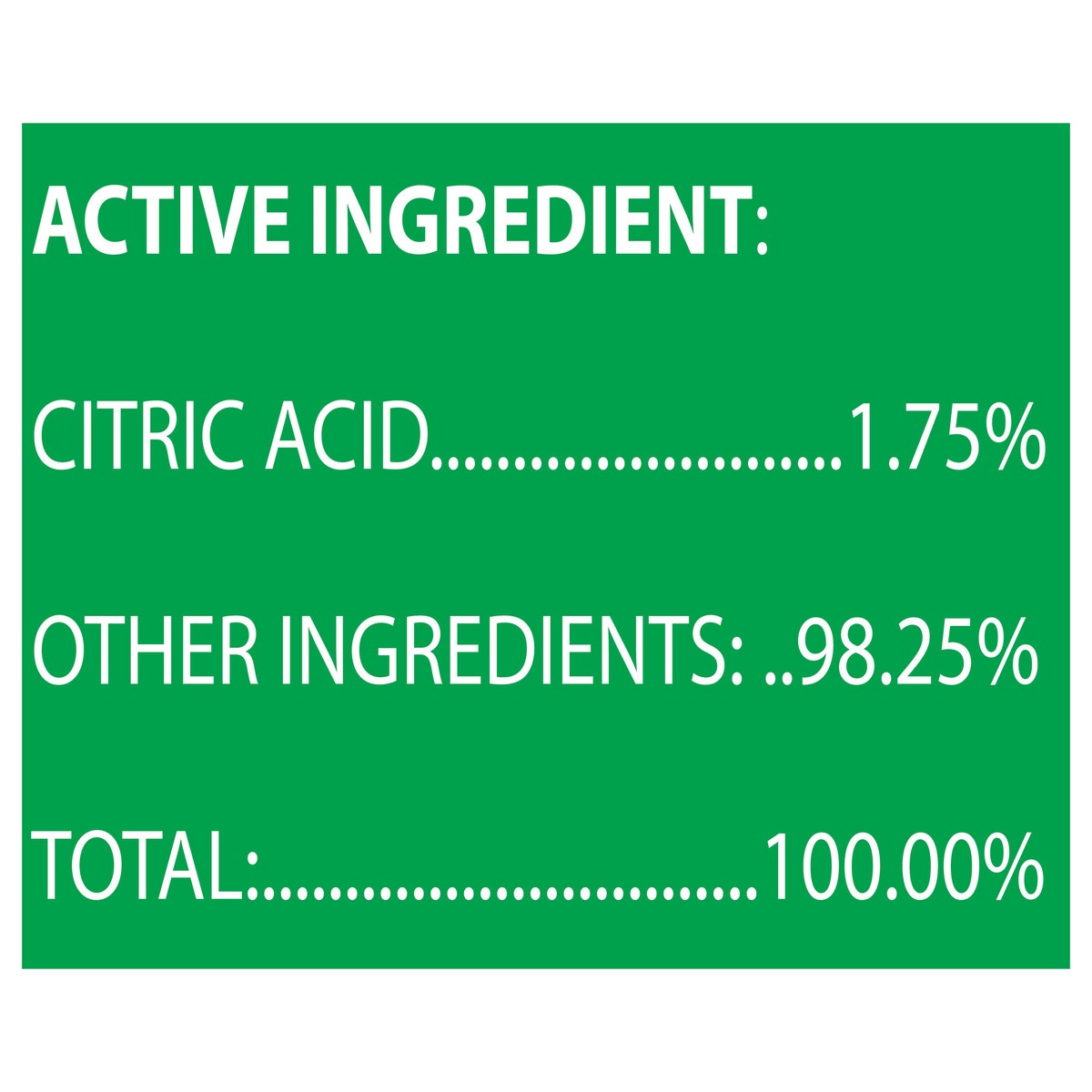 Active Ingredient: Citric Acid (1.75%). Other Ingredients (98.25%), Total: 100.00%.