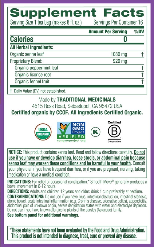 Traditional Medicinals Organic Smooth Move Tea Bags Senna Peppermint Herbal Supplement 16 ea