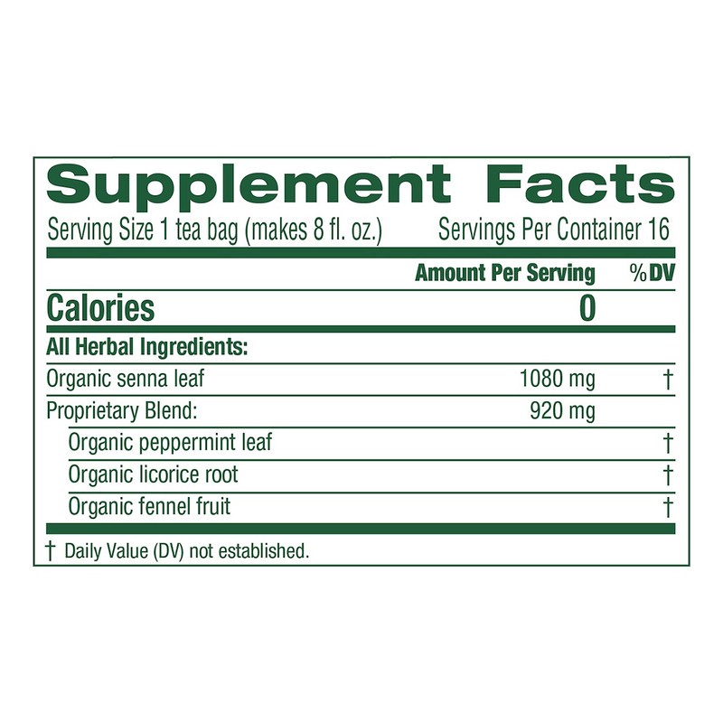 - Generally within 6-12 hours.*TASTE: Fresh and earthy with notes of sweet peppermint.America's #1 Laxattive Tea. Time-tested for over 40 years.USDA Certified Organic. Non-GMO Verified. Kosher. Caffeine Free. Certified B Corp. Compostable Tea Bags.Consistently high quality herbs from ethical trading partnerships. Medicinal-grade organic senna leaf.