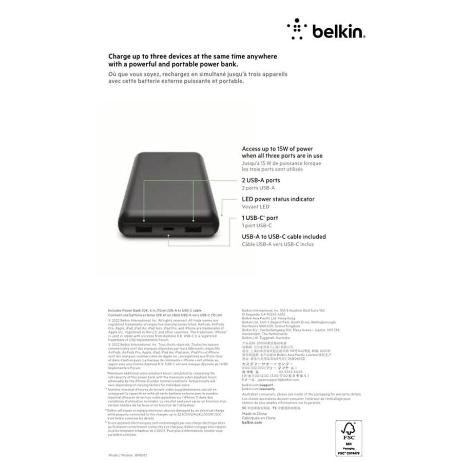 For: Apple; Samsun; Google; Huawei. Charge three devices at once. 20,000 mAh up to 78 hours of extra battery life (Maximum additional video playback hours calculated by comparing the cell capacity of …