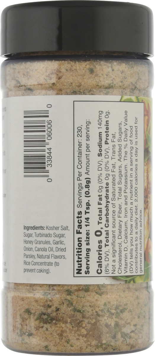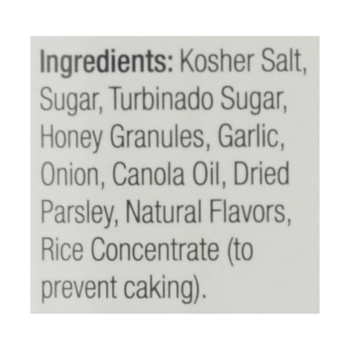 Kosher Salt, Sugar, Turbinado Sugar, Honey Granules, Garlic, Onion, Canola Oil, Dried Parsley, Natural Flavors, Rice Concentrate (to Prevent Caking).