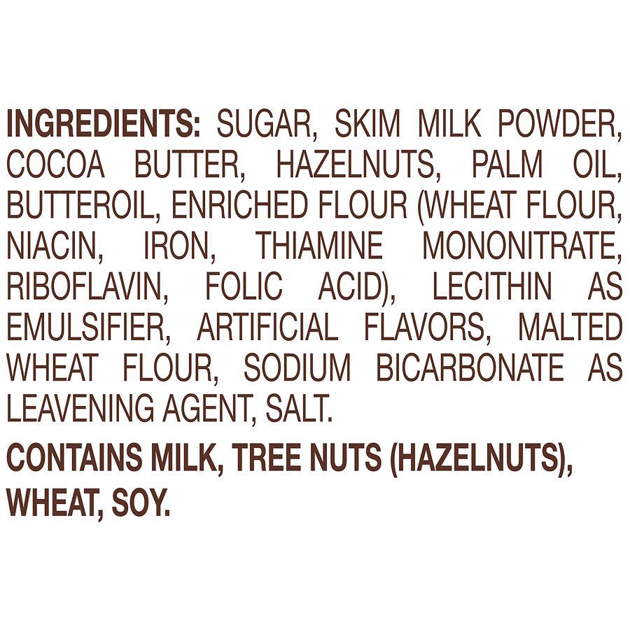 Sugar, Skim Milk Powder, Cocoa Butter, Hazelnuts, Palm Oil, Butteroil, Enriched Flour (Wheat Flour, Niacin, Iron, Thiamine Mononitrate, Riboflavin, Folic Acid), Lecithin as Emulsifier, Artificial Flav…