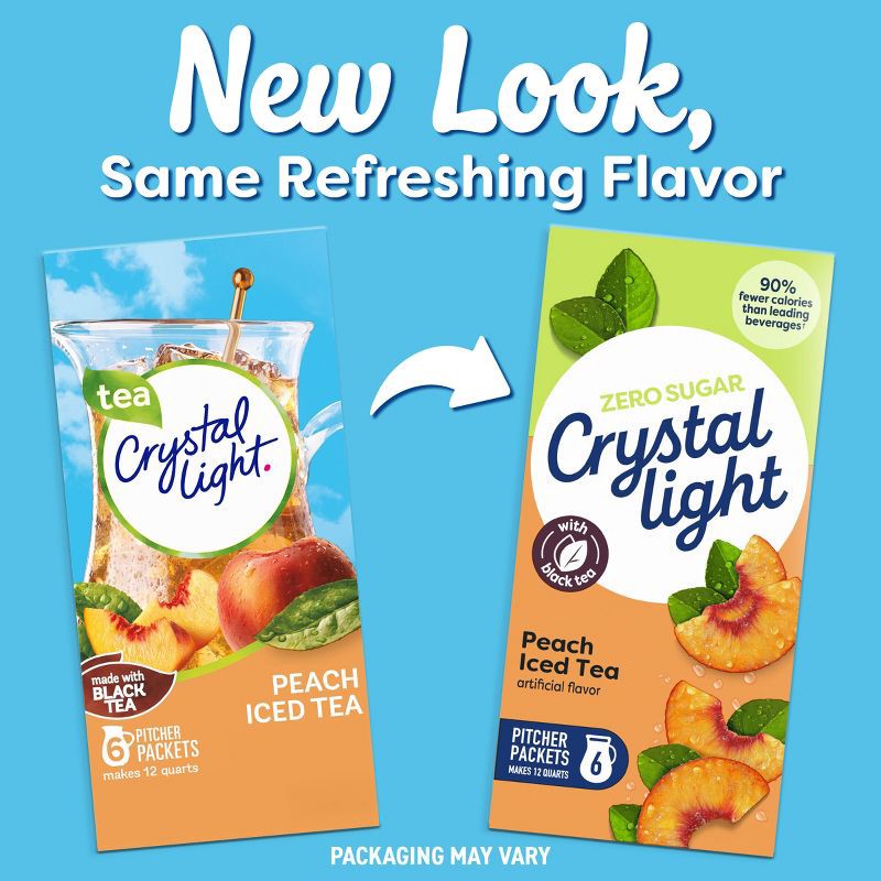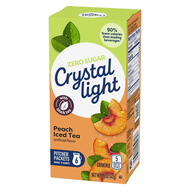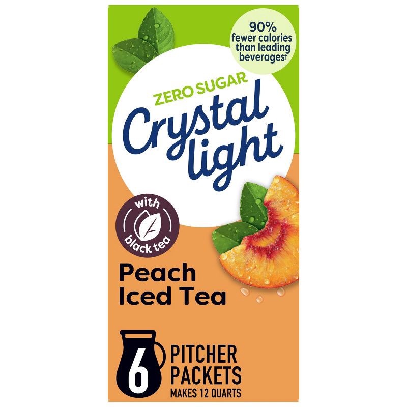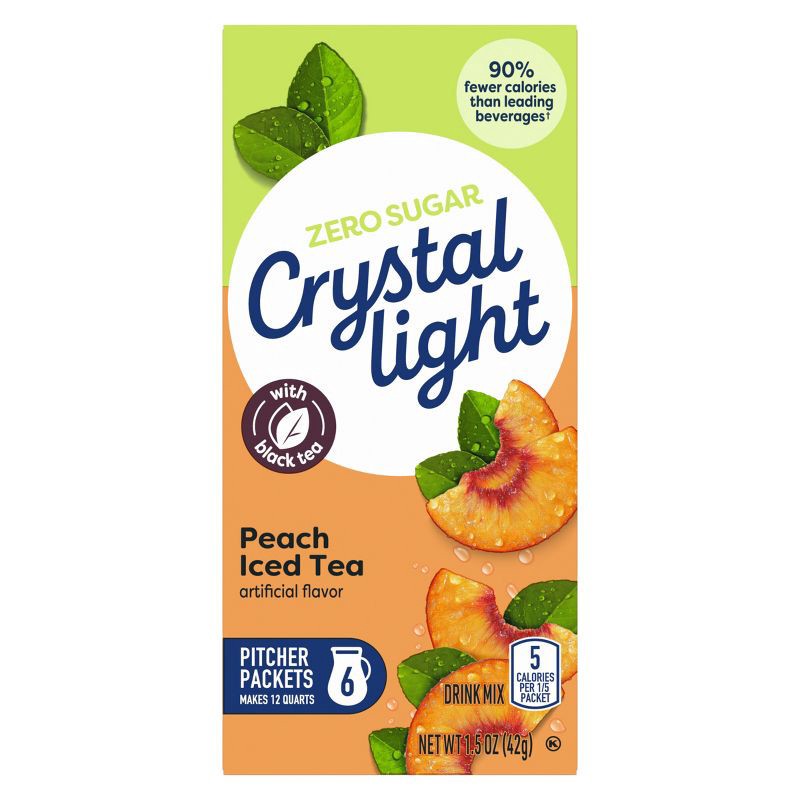- ICED TEA MIX: 6 pitcher packets of Crystal Light Peach Iced Tea artificial flavor Made with Black Tea Powdered Drink Mixes