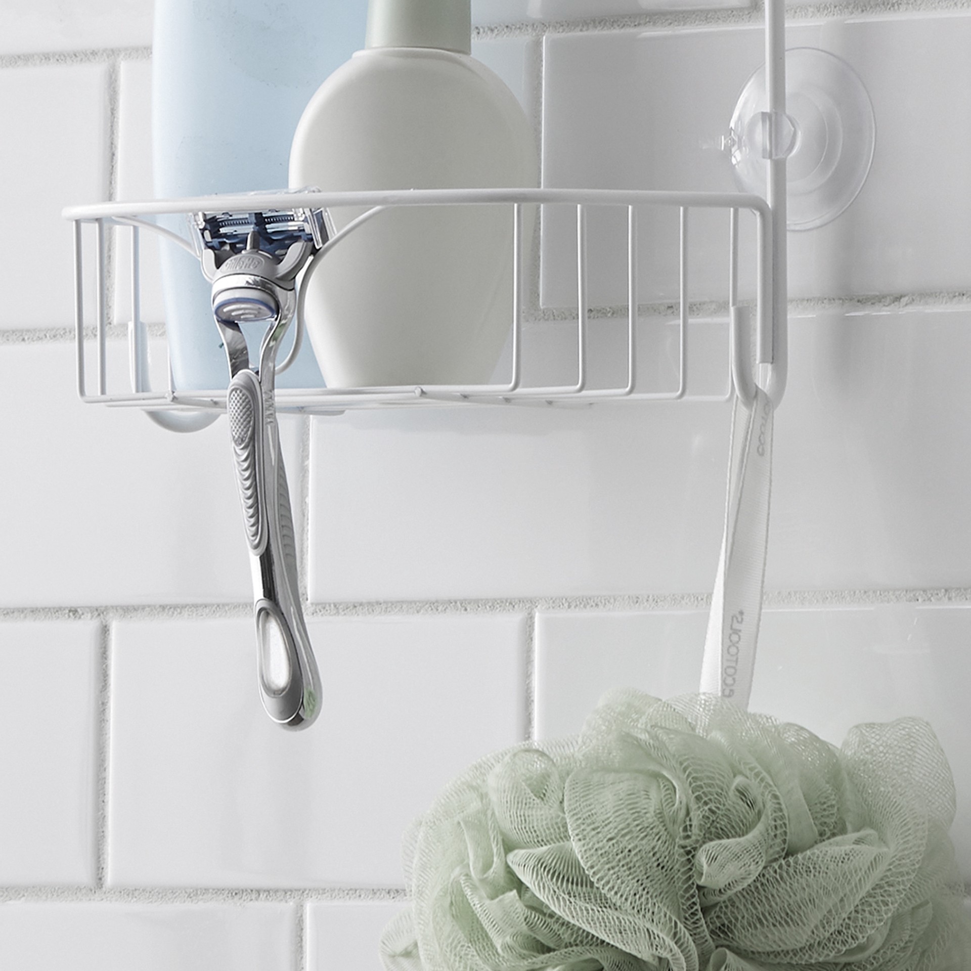 Showerhead caddy fits over most shower heads to create more in-the-shower storage. Includes 2 shelves for storing shampoo and conditioner bottles plus other bath items. Also has built-in razor holders…
