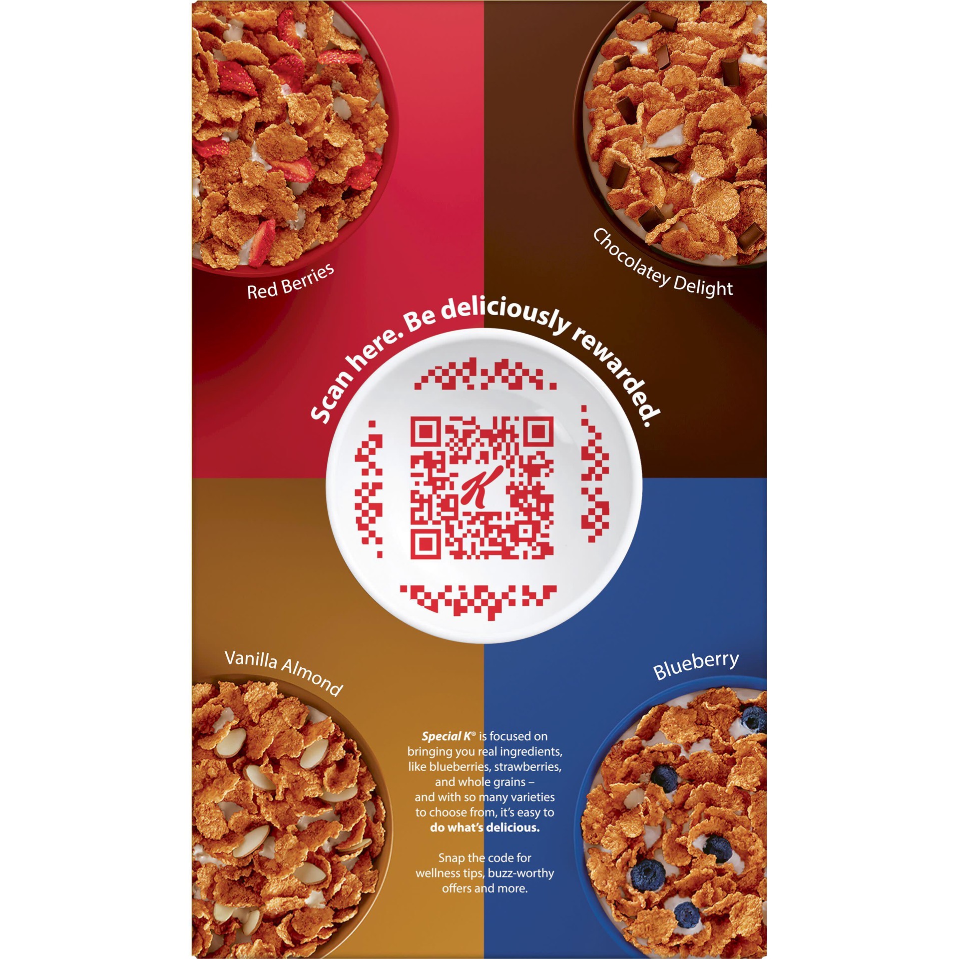 New! Scan. Be deliciously rewarded. Red berries. Chocolate delight. Vanilla almond. Blueberry. Special K is focused on bringing you real ingredients, like blueberries, strawberries, and whole grains -…