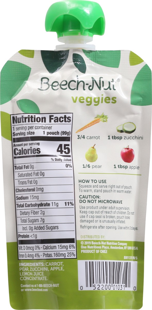 Beech-Nut Baby and Toddler Food Pouches are made with real ingredients and packed in convenient pouches for on-the-go feeding. Our veggies blend contains carrot, zucchini and pear--great for introduci…