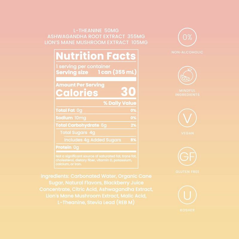 Carbonated Water, Organic Cane Sugar, Natural Flavors, Blackberry Juice Concentrate, Citric Acid, Ashwagandha Extract, Lion's Mane Mushroom Extract, Malic Acid, L-Theanine, Stevia Leaf (REB M)
