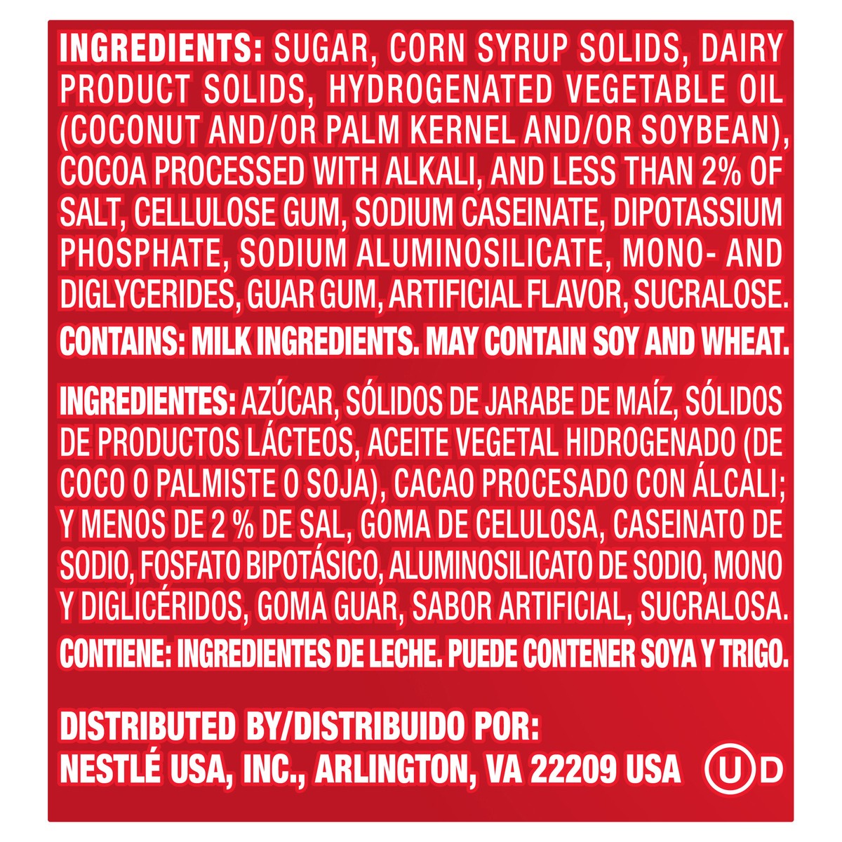 SUGAR, CORN SYRUP SOLIDS, HYDROGENATED VEGETABLE OIL (COCONUT AND/OR PALM KERNEL AND/OR SOYBEAN), DAIRY PRODUCT SOLIDS, COCOA PROCESSED WITH ALKALI, CALCIUM CARBONATE, AND LESS THAN 2% OF SALT, CELLUL…