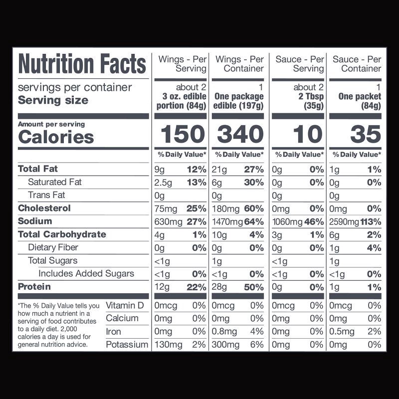 Chicken Wing - Chicken Wing Sections, Water, Contains 2% or less of Modified Food Starch, Salt, Rice Flour, Sodium Phosphates, Maltodextrin, Dextrose, Natural Flavors, Algin, Par-fried in Vegetable Oi…