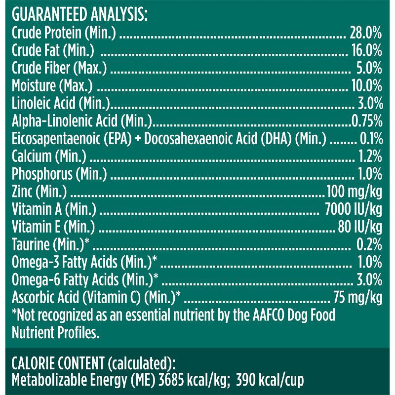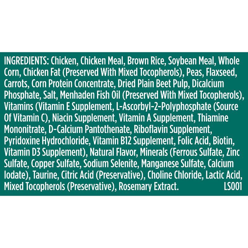 Chicken, Chicken Meal, Brown Rice, Soybean Meal, Whole Corn, Chicken Fat (Preserved with Mixed Tocopherols), Peas, Flaxseed, Carrots, Corn Protein Concentrate, Dried Plain Beet Pulp, Dicalcium Phospha…