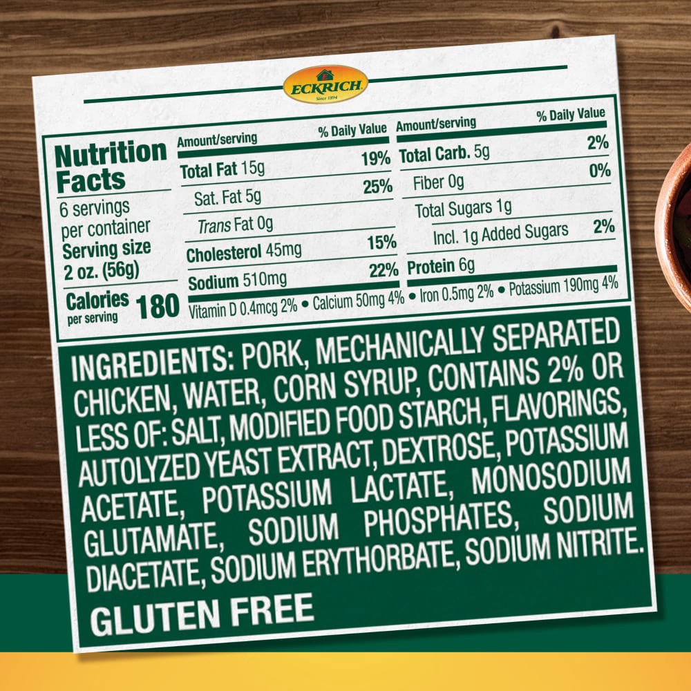 Pork, Mechanically Separated Chicken, Water, Contains 2% or Less of: Salt, Spices, Dextrose, Sodium Phosphates, Potassium Acetate, Potassium Lactate, Sodium Diacetate, Sodium Erythorbate, Sodium Nitra…