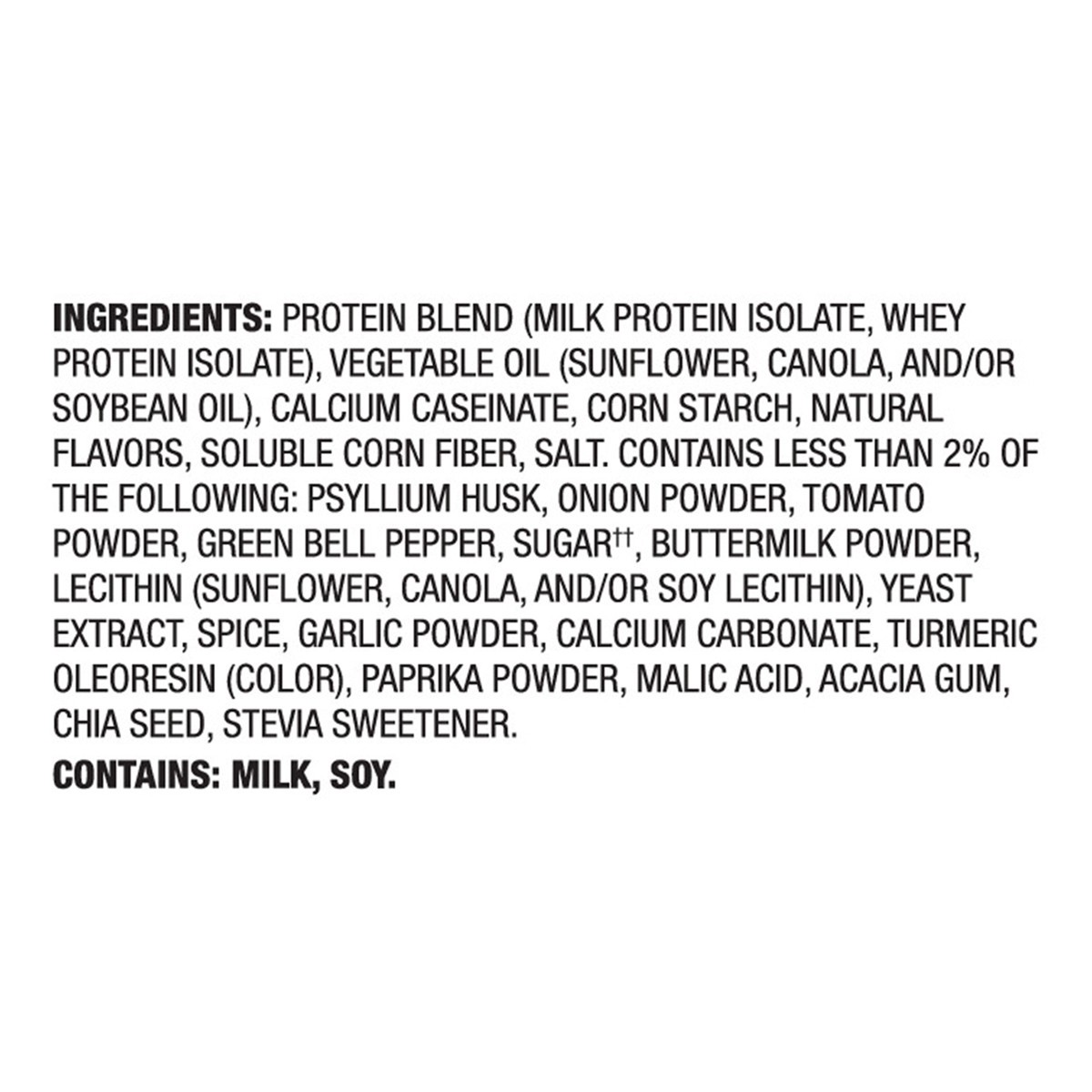 Protein Blend (Milk Protein Isolate, Whey Protein Isolate), Vegetable Oil (Sunflower, Canola, and/or Soybean Oil), Calcium Caseinate, Corn Starch, Natural Flavors, Soluble Corn Fiber, Salt, Contains L…