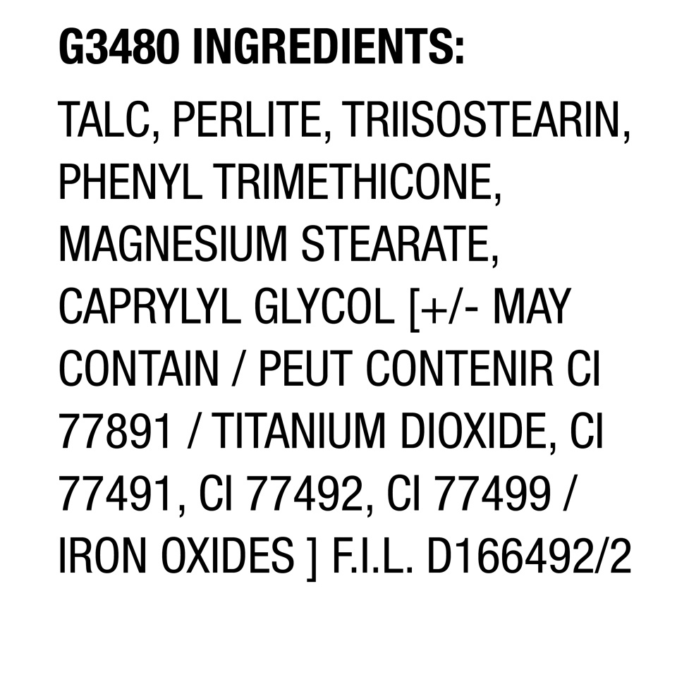 G3480 Talc, Perlite, Triisostearin, Phenyl Trimethicone, Magnesium Stearate, Caprylyl Glycol. [+/- May Contain: CI 77891/Titanium Dioxide, CI 77491, CI 77492, CI 77499/Iron Oxides]. D166492/2.