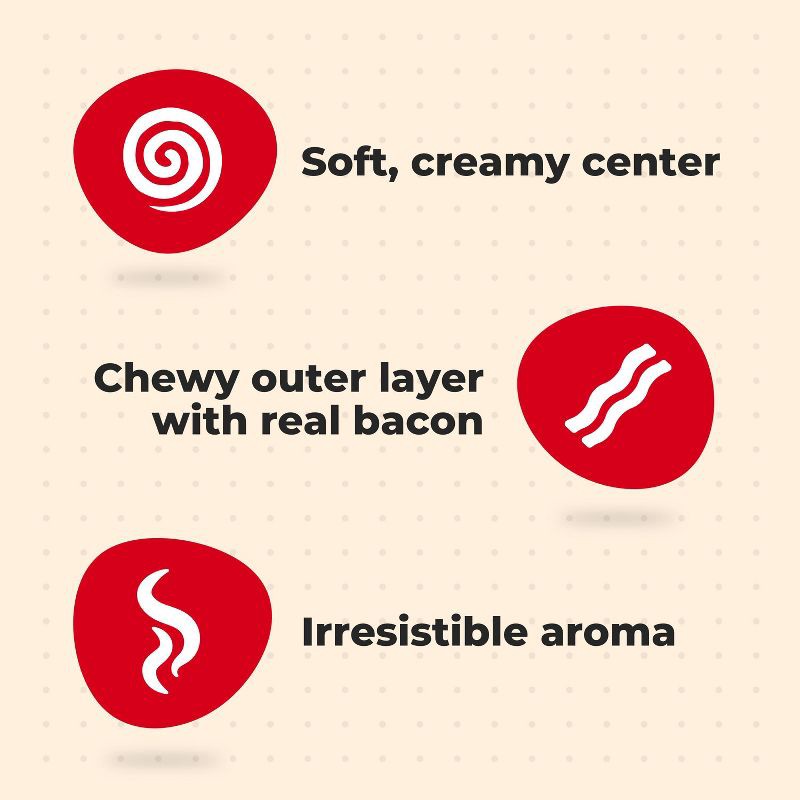 - DUAL TASTES & TEXTURES: A satisfyingly chewy outer layer with real bacon, and a soft, creamy center