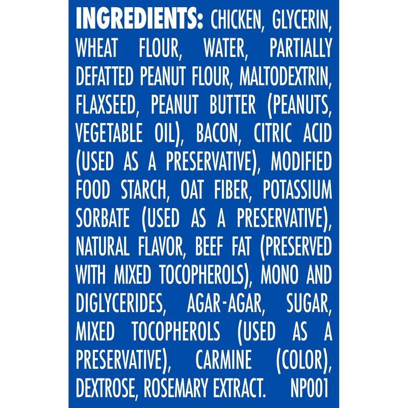 Chicken, Glycerin, Wheat Flour, Water, Partially Defatted Peanut Flour, Maltodextrin, Flaxseed, Peanut Butter (Peanuts, Vegetable Oil), Bacon, Citric Acid (Used as a Preservative), Modified Food Starc…