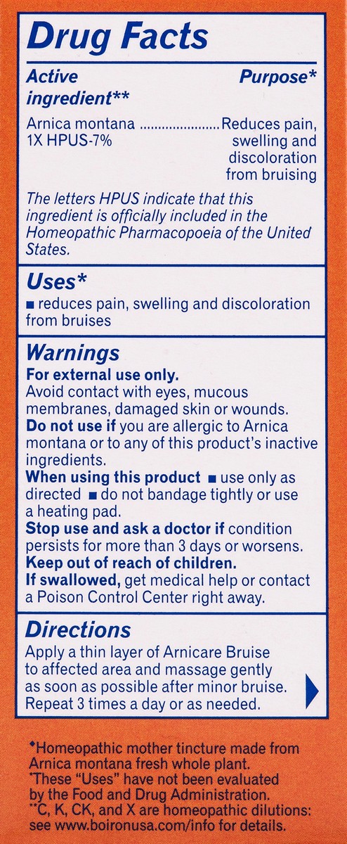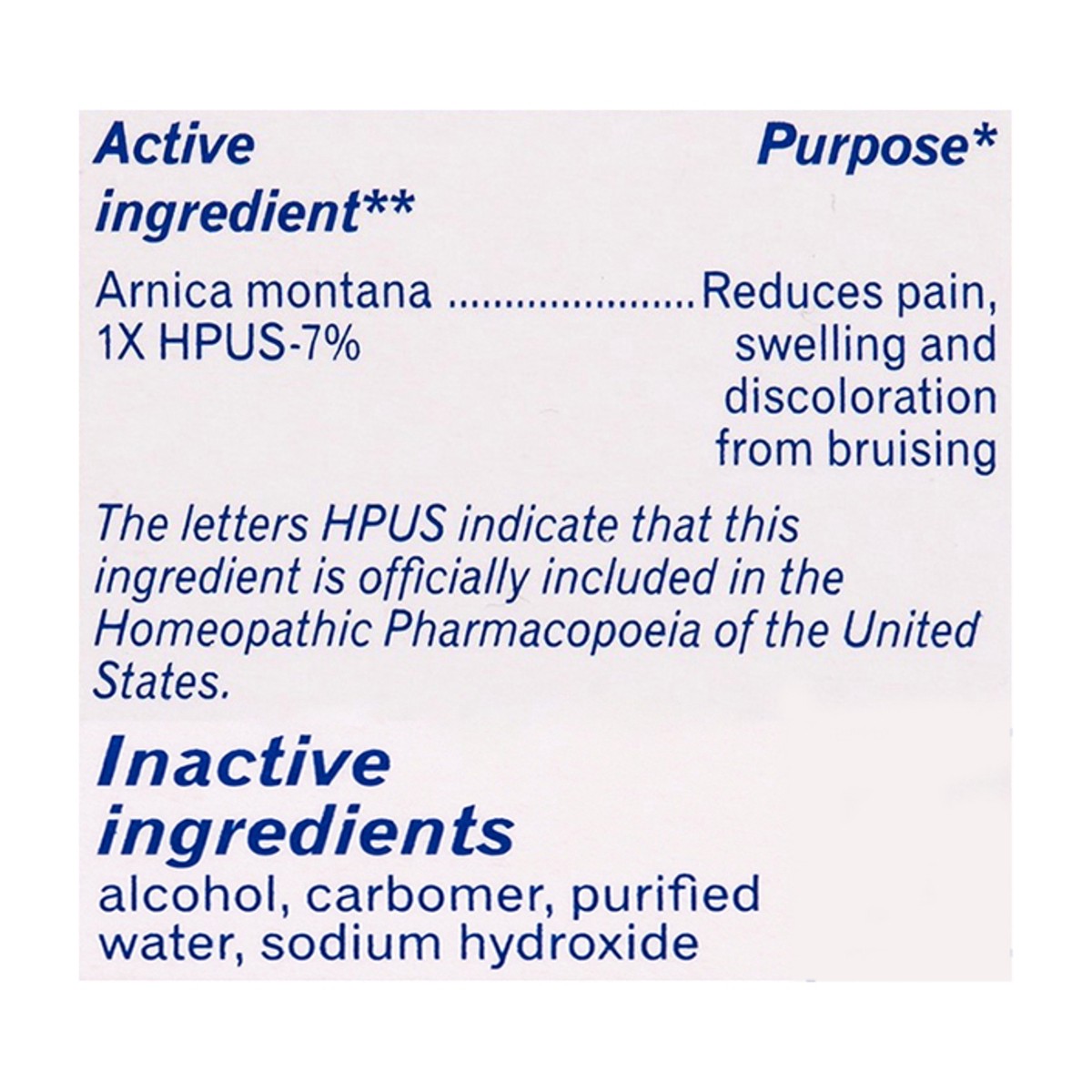 Active Ingredients: Arnica Montana 1x HPUS (7 %), Reduces Pain, Swelling, and Discoloration from Bruising. Inactive Ingredients: Alcohol, Carbomer, Purified Water, Sodium Hydroxide.