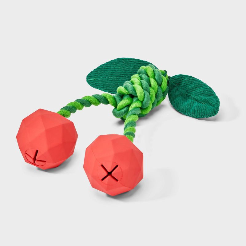 This Cherries Dog Toy - Boots & Barkley™ is literally cherry-picked for your furry friend. Featuring two red cherries with a faceted design and attached to a green twisted rope with leaves, it's a swe…