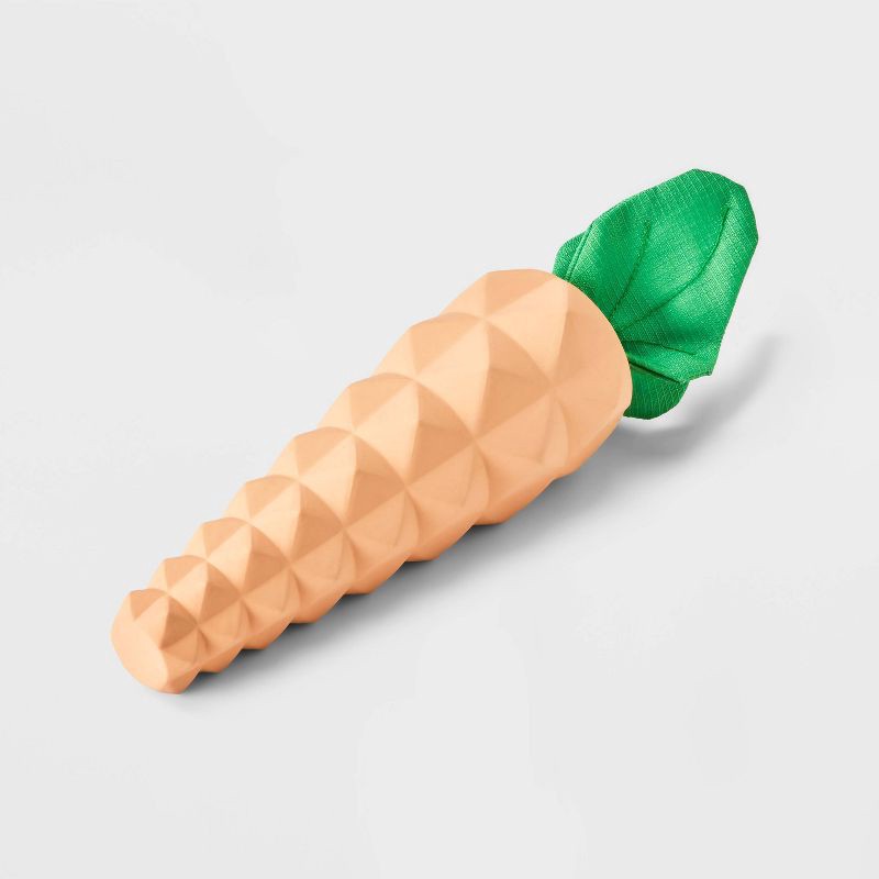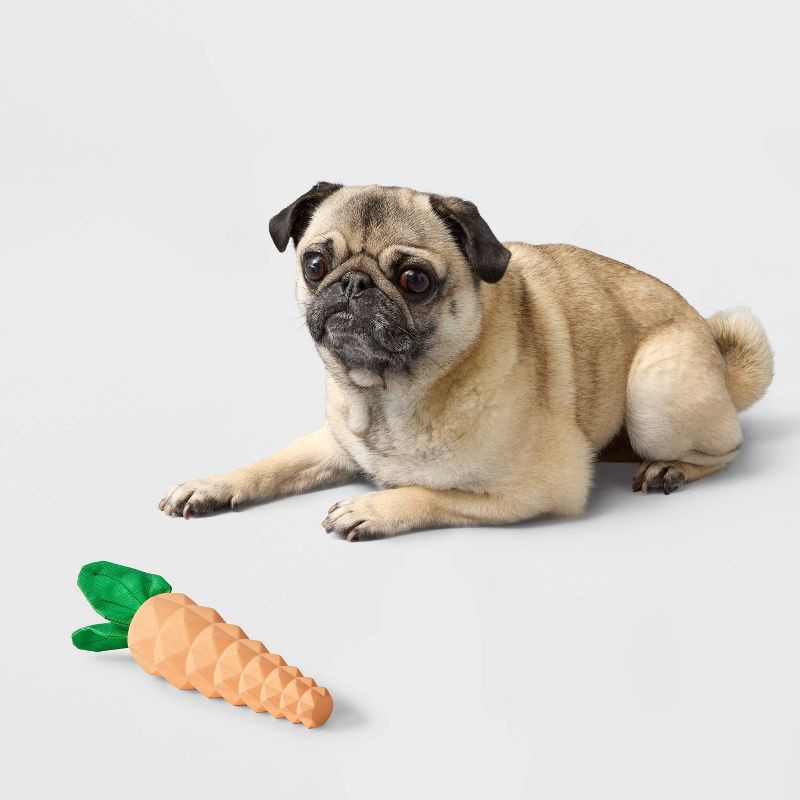 This Carrot Food-Shaped Dog Toy from Boots & Barkley™ brings playful fun to your pup's day. Designed to look like a carrot with a faceted design in light orange with a green foliage top, this rubber t…